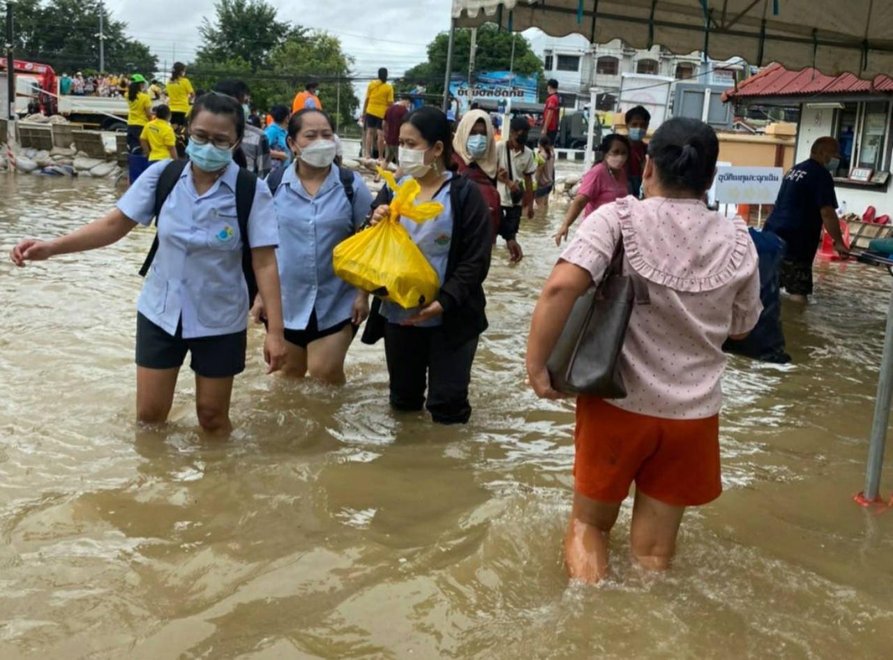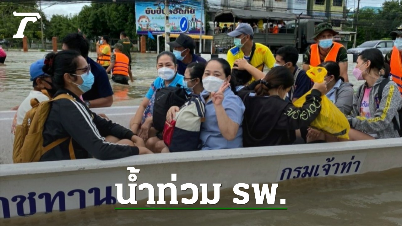 มวลน้ำทะลักต่อเนื่อง ท่วม รพ.สุโขทัย ซึ่งอยู่ติดกับคลองระบายน้ำ สูง 1 เมตร แต่ยังเปิดให้บริการปกติ โดยมีเจ้าหน้าที่นำรถบรรทุก เรือ ไปอำนวยความสะดวก