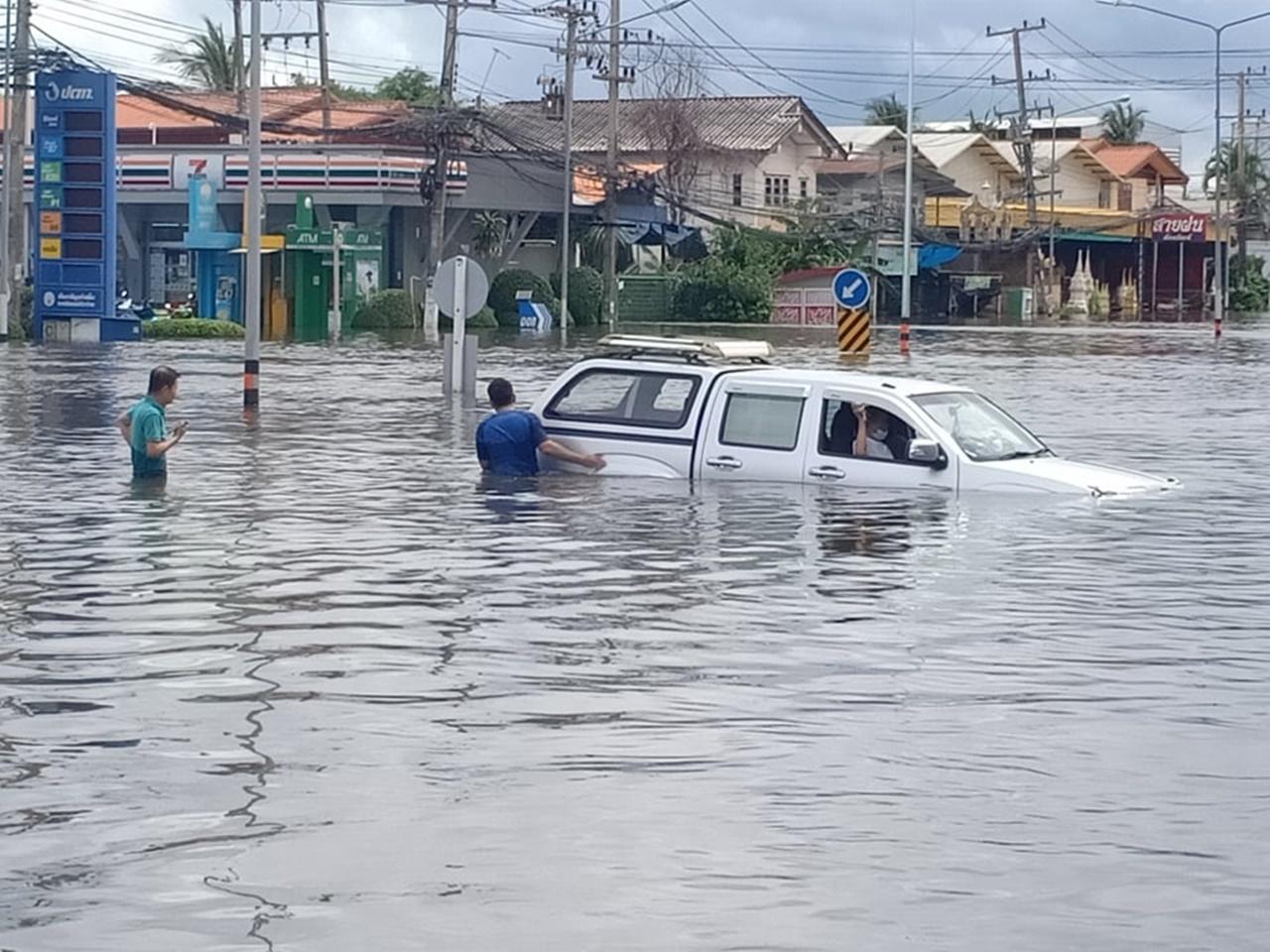 ที่หน้าปั๊มน้ำมันสุธนาปิโตรเลียม ถ.จรดวิถีถ่อง ม.13 ต.บ้านกล้วย ชาวบ้านต้องช่วยกันเข็นรถปิกอัพอีซูซุ 4 ประตู สีบรอนซ์ ทะเบียน 1584 พิษณุโลก ออกจากจุดที่มีน้ำท่วมสูงประมาณ 1 เมตร อย่างทุลักทุเล หลังจากคนขับจะเดินทางไปทำธุระ ต.เมืองเก่า แต่ไม่ชำนาญเส้นทาง ซึ่งถนนเส้นนี้มีน้ำท่วมสูง 1-1.5 เมตร เป็นระยะทางยาวประมาณ 10 กม.