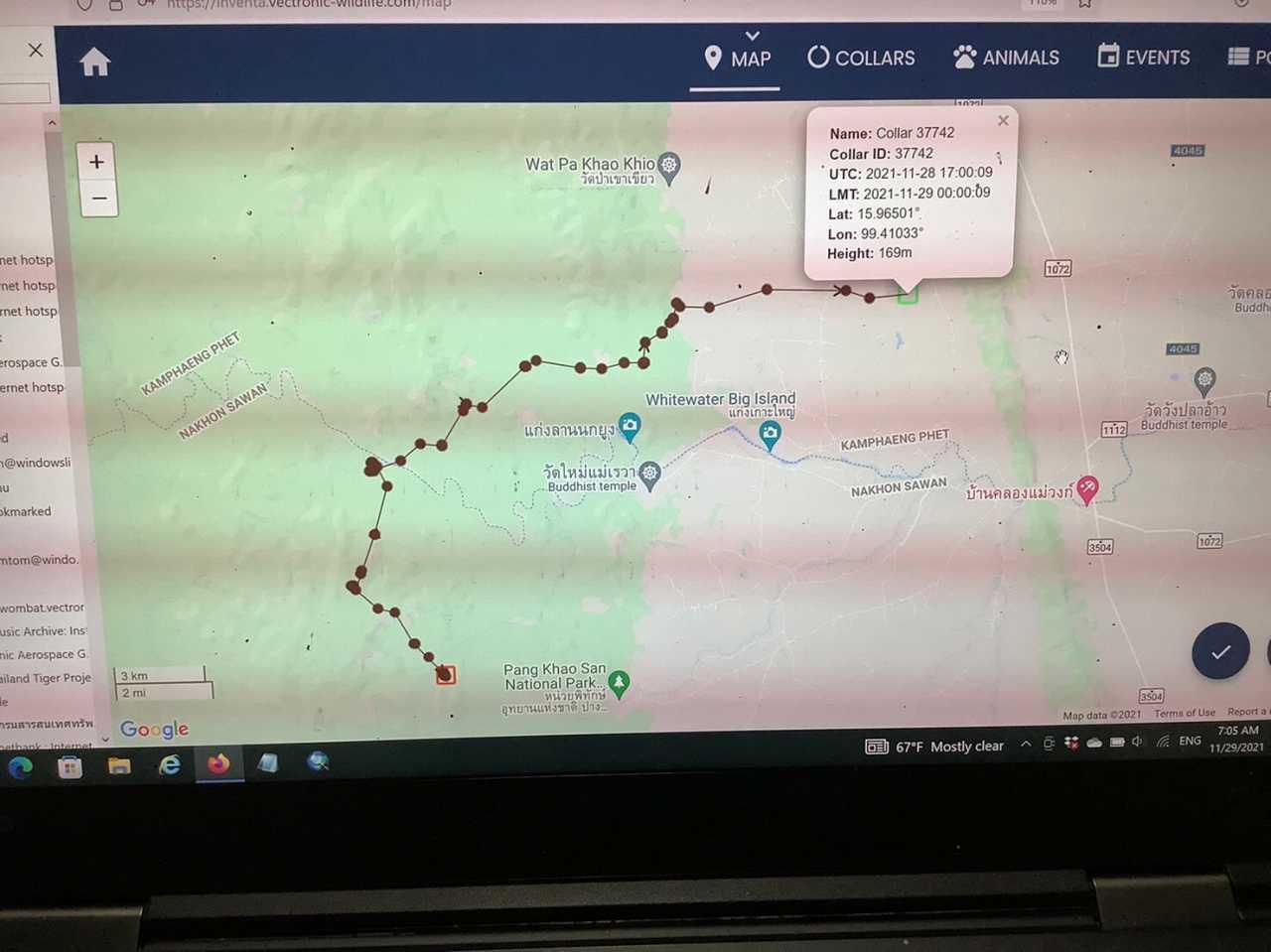 ต่อมาเมื่อวันที่ 29 พ.ย.2564 เวลา 00.09 น. สัญญาณหยุดนอกเขตอุทยานแห่งชาติแม่วงก์ อยู่ในพื้นที่ชาวบ้าน บริเวณหมู่บ้านใน ต.ปางมะค่า อ.ขาณุวรลักษบุรี จ.กำแพงเพชร และจนกระทั่งช่วงเช้าเวลาประมาณ 10.00 น. พบรอยเท้าเสือเดินป้วนเปี้ยนอยู่บริเวณป่าเขาน้ำอุ่น ไม่ไกลจากหมู่บ้านมอสมบูรณ์ ม.11 ต.ปางมะค่า อ.ขาณุวรลักษบุรี จ.กำแพงเพชร