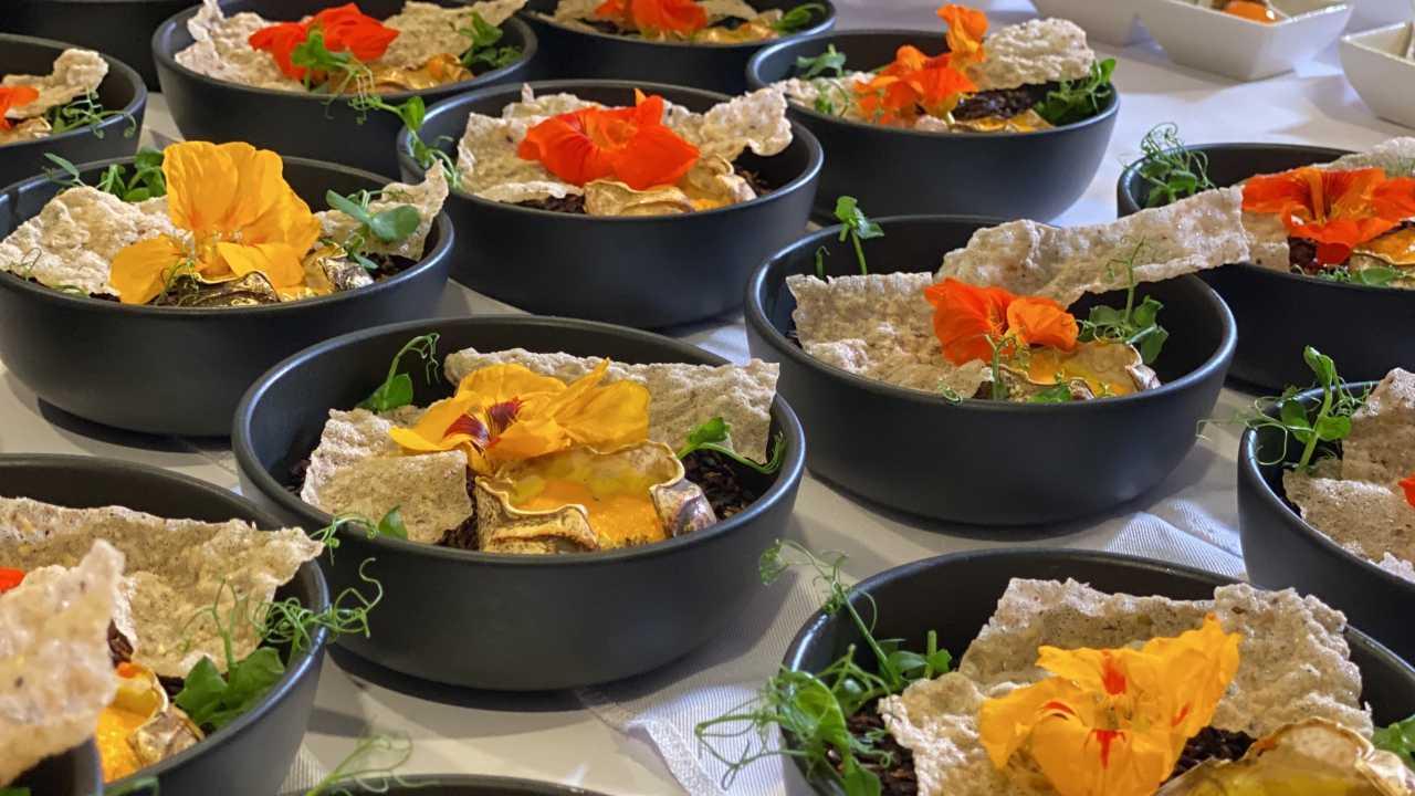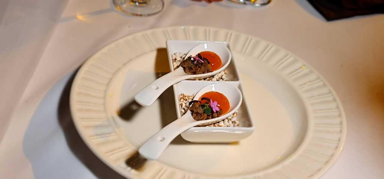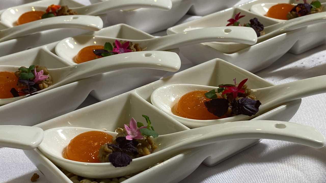 สำหรับเมนูอาหารที่นำมาเสิร์ฟ อาทิ เมี่ยงลาบปลาเพี้ย ที่ปกติเวลาเราไปรับประทานอาหารที่ร้านทั่วไปจะใส่มาเป็นจานๆ แต่วันนี้ลาบปลาเพี้ยถูกนำมาจัดเป็นคำวางอยู่บนช้อนที่เจลลี่สีส้มเป็นเครื่องเคียงตกแต่งด้วยผักและดอกเข็มที่กินได้เมื่ออยู่บนจานแล้วดูสวยงามสร้างความตื่นตาตื่นใจให้กับผู้ที่มาร่วมงานครั้งนี้เป็นอย่างมากเมื่อถูกยกมาเสิร์ฟ ตามมาด้วย ข้าวเกรียบแรมฟืน ทรัฟเฟิลมาโย และเชียงดาเนยกระเทียมที่เชฟได้ยกมาเสิร์ฟนั้นเป็นขนมปังที่ทำจากผักเชียงดา ที่เป็นผักพื้นถิ่นมีสรรพคุณเป็นยารักษาโรคบำรุงสายตา รักษาไข้หวัด
