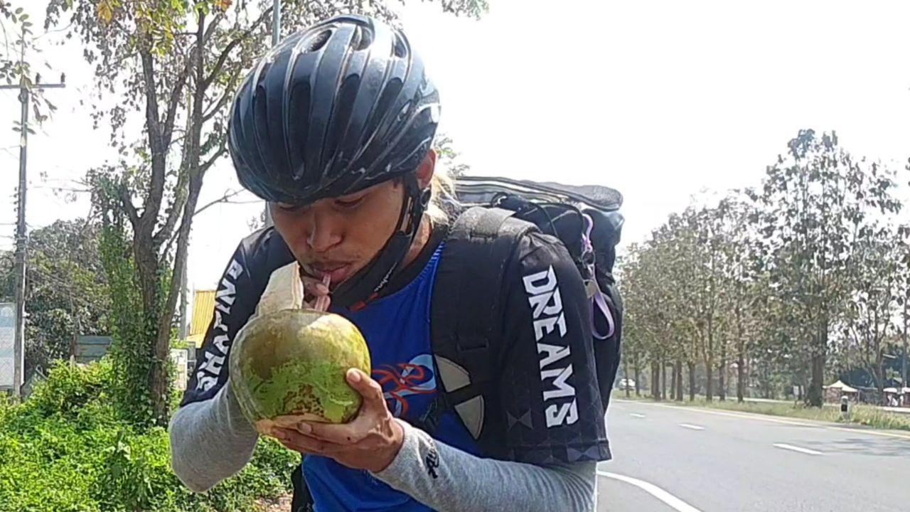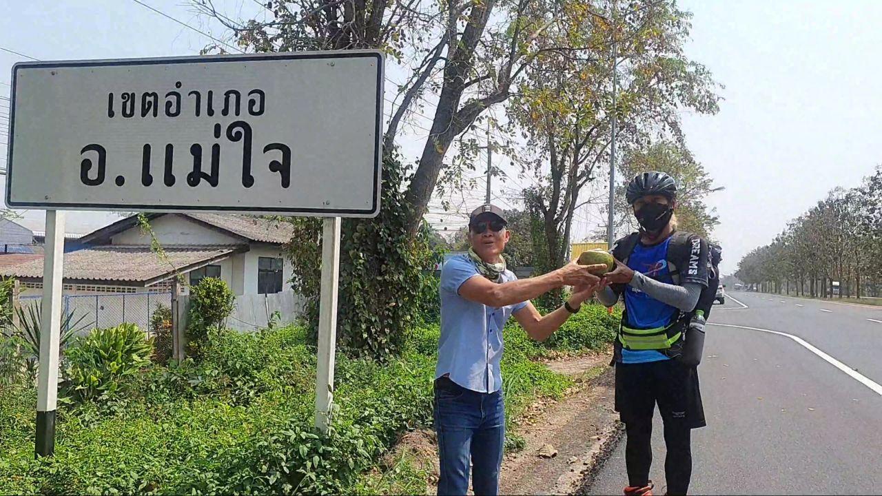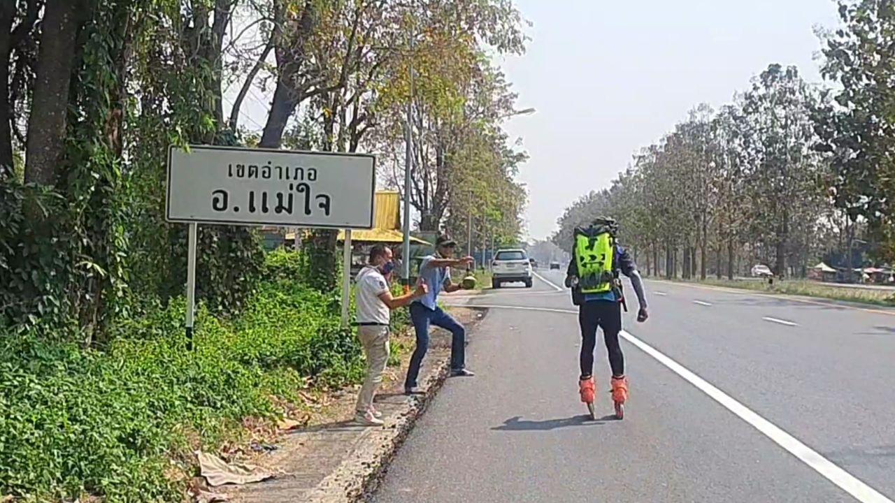หนุ่มโรลเลอร์เบลดฉายเดี่ยวจาก อ.แม่สาย เชียงราย ไปยะลา ล่าสุดวันนี้มาถึง อ.แม่ใจ จ.พะเยา ชาวบ้านต้อนรับด้วยมะพร้าว ก่อนที่จะหาที่พักเพื่อออกเดินทางใหม่วันพรุ่งนี้ เพื่อเข้าตัว อ.เมืองพะเยา