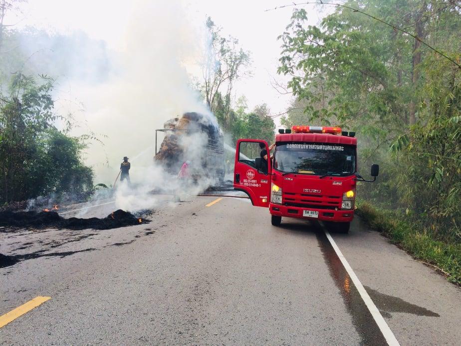 ที่เกิดเหตุเป็นถนนสายหลักมีการจราจรหนาแน่นโดยที่กลางถนนพบรถยนต์บรรทุก 10 ล้อ ยี่ห้อฮีโน่ สีขาว หมายเลขทะเบียน 70-1315 สุโขทัย ซึ่งด้านหลังรถบรรทุกฟางก้อนอัดแท่งมาเต็มคันรถซึ่งรถคันดังกล่าวกำลังเกิดเพลิงไหม้ฟางก้อนอัดแท่งที่บรรทุกมาทั้งคันรถโดยเพลิงลุกไหม้อย่างรุนแรงและอย่างรวดเร็วส่วนภายในรถพบตัวนายบุญมี ปานเขียว อายุ 66 ปี เป็นคนขับรถคันเกิดเหตุซึ่งยังคงมีสติซึ่งกำลังใช้ความพยายามจะขับประคองรถไปบนถนนเพื่อหาที่จอดที่ปลอดภัยเพื่อให้พ้นที่ชุมชนซึ่งระหว่างที่รถคันดังกล่าวกำลังขับเคลื่อนนั้นก็ส่งผลทำให้มีฟางก้อนอัดแท่งปะทะกับลมจนทำให้เพลิงโหมไหม้กองฟางจำนวนมากยิ่งขึ้น และทำให้เพลิงลุกไหม้อย่างรวดเร็ว และยังทำให้ฟางอัดแท่งที่กำลังไหม้ไฟอยู่นั้นตกหล่นจากท้ายรถบรรทุกไปบนถนนจนถนนจุดดังกล่าวกลายเป็นทะเลเพลิงจนชาวบ้านที่ใช้รถใช้ถนนในขณะนั้นต่างตกใจกลัวต้องจอดรถและไม่มีใครกล้าจะขับรถผ่านเนื่องจากเกรงอันตราย จนเวลาต่อมารถดับเพลิงจาก อบต.แม่หละ จำนวน 1 คันพร้อมเจ้าหน้าที่หลายสิบนายจึงเดินทางมาถึงพร้อมเข้าไปช่วยกันฉีดน้ำสกัดเพลิงโดยต้องใช้เวลานานกว่า 30 นาที เจ้าหน้าที่จึงสามารถควบคุมเพลิงได้สำเร็จและหลังเพลิงสงบพบว่าฟางก้อนอัดแท่งจำนวนหลายร้อยก้อนน้ำหนักเกือบ 3 ตัน ถูกเพลิงไหม้เสียหายเกือบทั้งหมดแต่โชคดีที่รถบรรทุกเสียหายเพียงบางส่วนก่อนนาทีต่อมาเจ้าหน้าที่จะเปิดการจราจรได้ตามปกติอีกครั้งท่ามกลางความโล่งใจของชาวบ้านจำนวนมากที่มาลุ้นการดับเพลิงในครั้งนี้