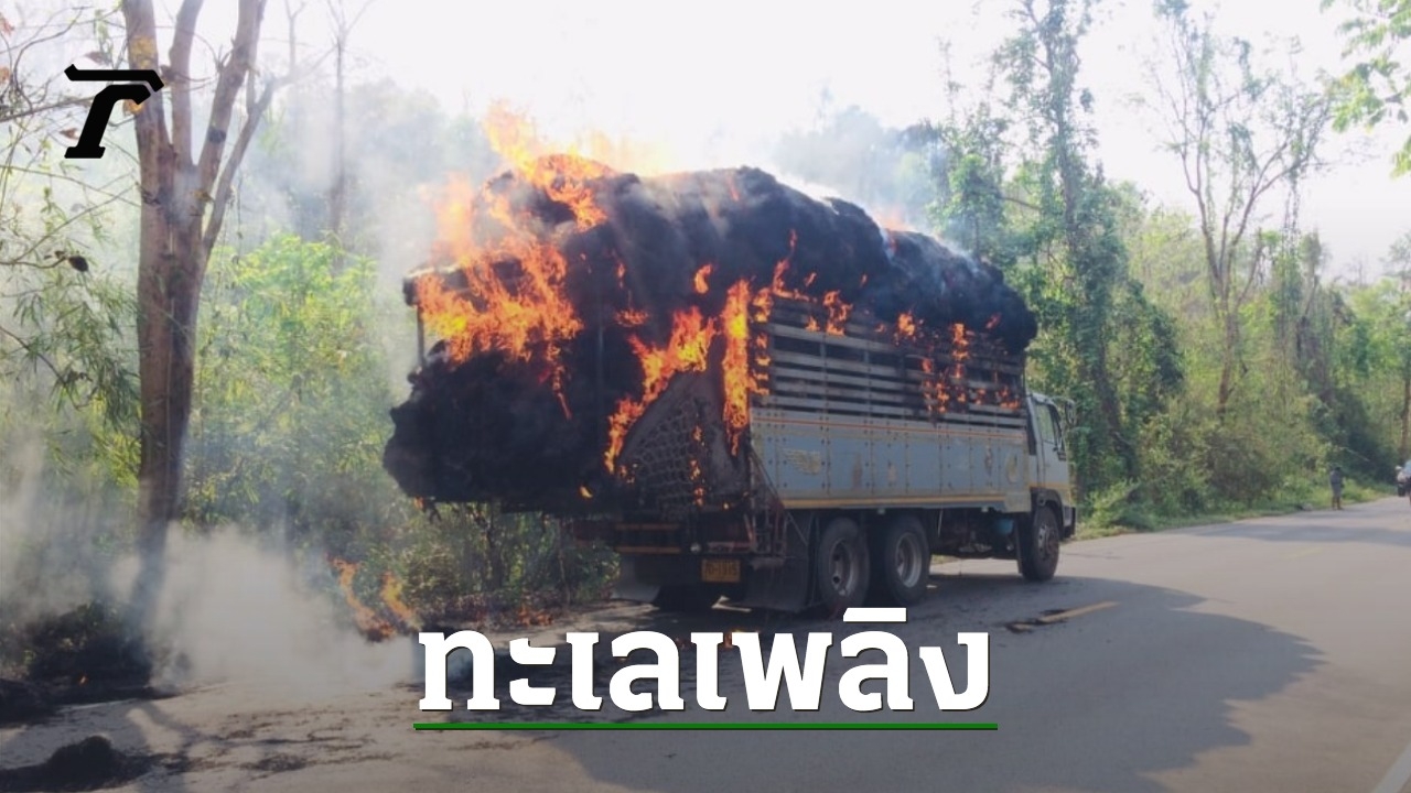 ระทึก รถสิบล้อบรรทุกฟางก้อน 3 ตัน เกิดไฟไหม้ท่วมคัน กลายเป็นทะเลเพลิงฟางกลางถนน โชเฟอร์ต้องทิ้งรถหนีตายหวิดถูกไฟคลอก ทหารพราน ตำรวจ ฝ่ายปกครองต้องระดมรถน้ำไปดับเพลิงบนถนนสายแม่สอด-ท่าสองยาง