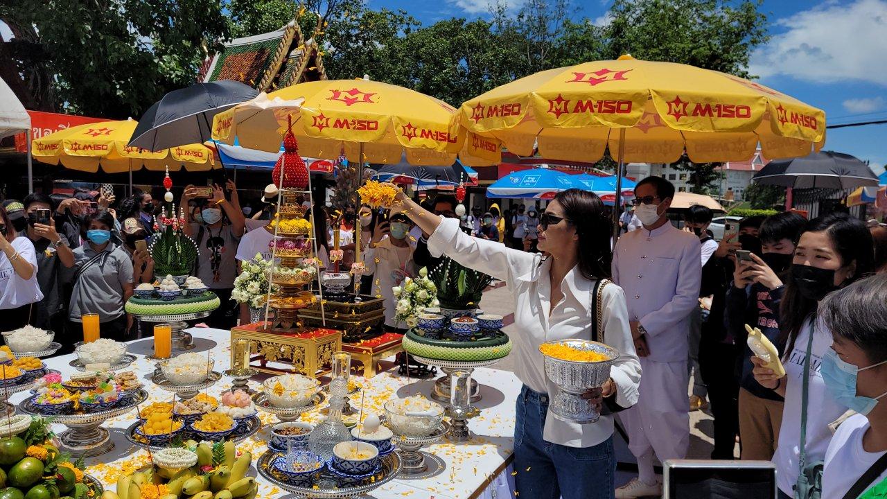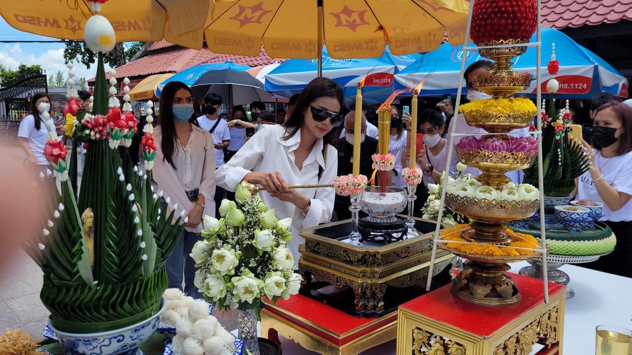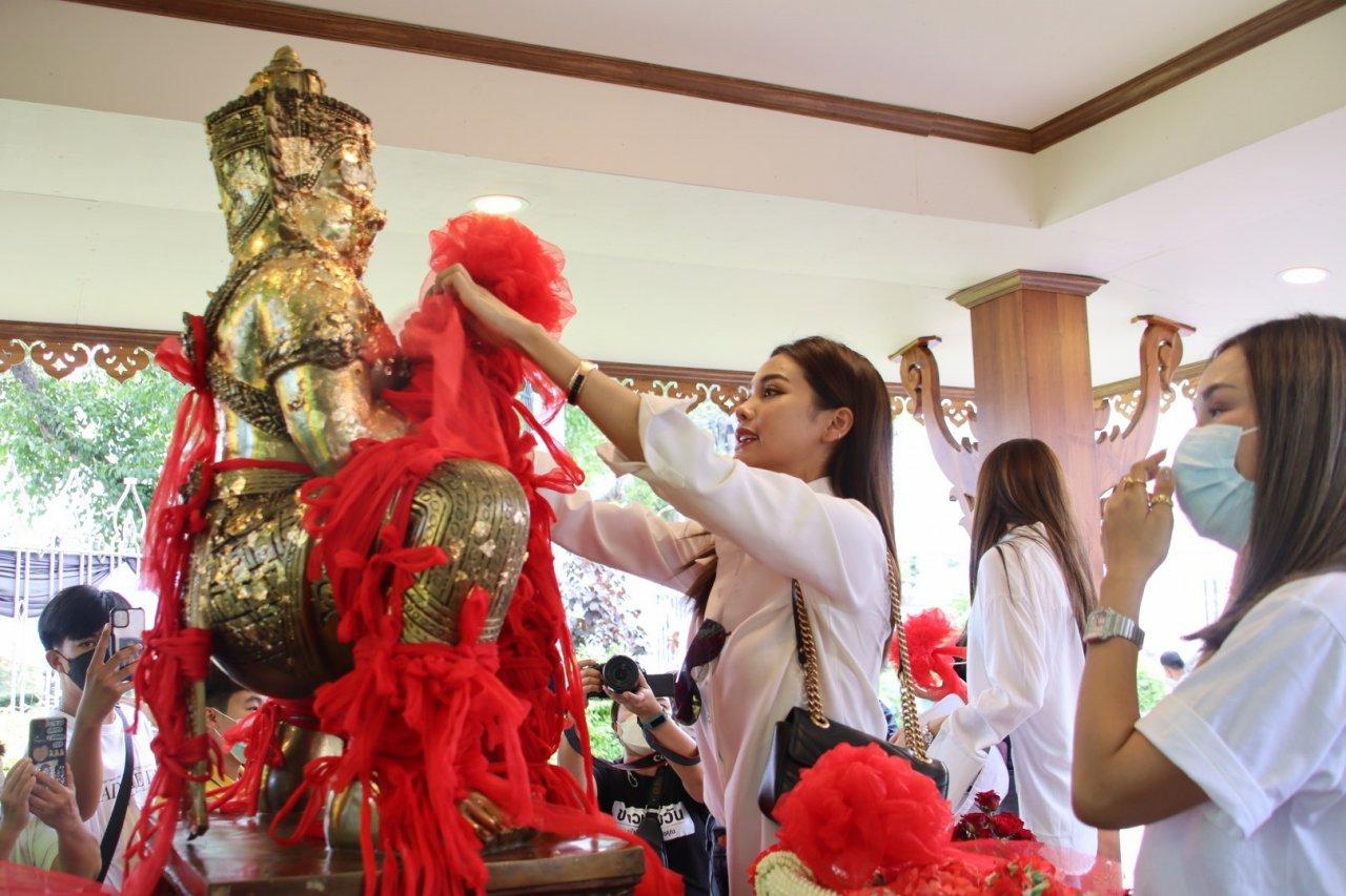 จากนั้นอิงฟ้าและชาล็อตได้เข้าไปภายในวิหาร เพื่อกราบไหว้สักการะพระพุทธชินราช และองค์ท้าวเวสสุวรรณ ก่อนประกอบพิธีบวงสรวงที่ด้านหน้าวิหาร พร้อมกับ นายธนเทพ ชีวสุทธิศิลป์ และภรรยา พร้อมบุตรสาว คือ นางสาวนรี ชีวสุทธิศิลป์ หรือน้องทราย เจ้าของน้ำหอมมาดามฟิน ชาวจังหวัดพิษณุโลก