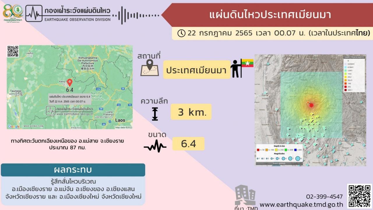 ต่อมาเมื่อเวลา 00.07 น. วันที่ 22 ก.ค.65 เกิดเหตุแผ่นดินไหวขึ้นอีกครั้ง โดยมีจุดศูนย์กลางอยู่ที่ประเทศเมียนมาเช่นเดียวกัน ขนาด 6.4 ที่ความลึก 3 กิโลเมตร พิกัด 21.219 องศาเหนือ 99.851 องศาตะวันออก ทางทิศตะวันตกเฉียงเหนือของ อ.แม่สาย จ.เชียงราย ประมาณ 87 กิโลเมตร