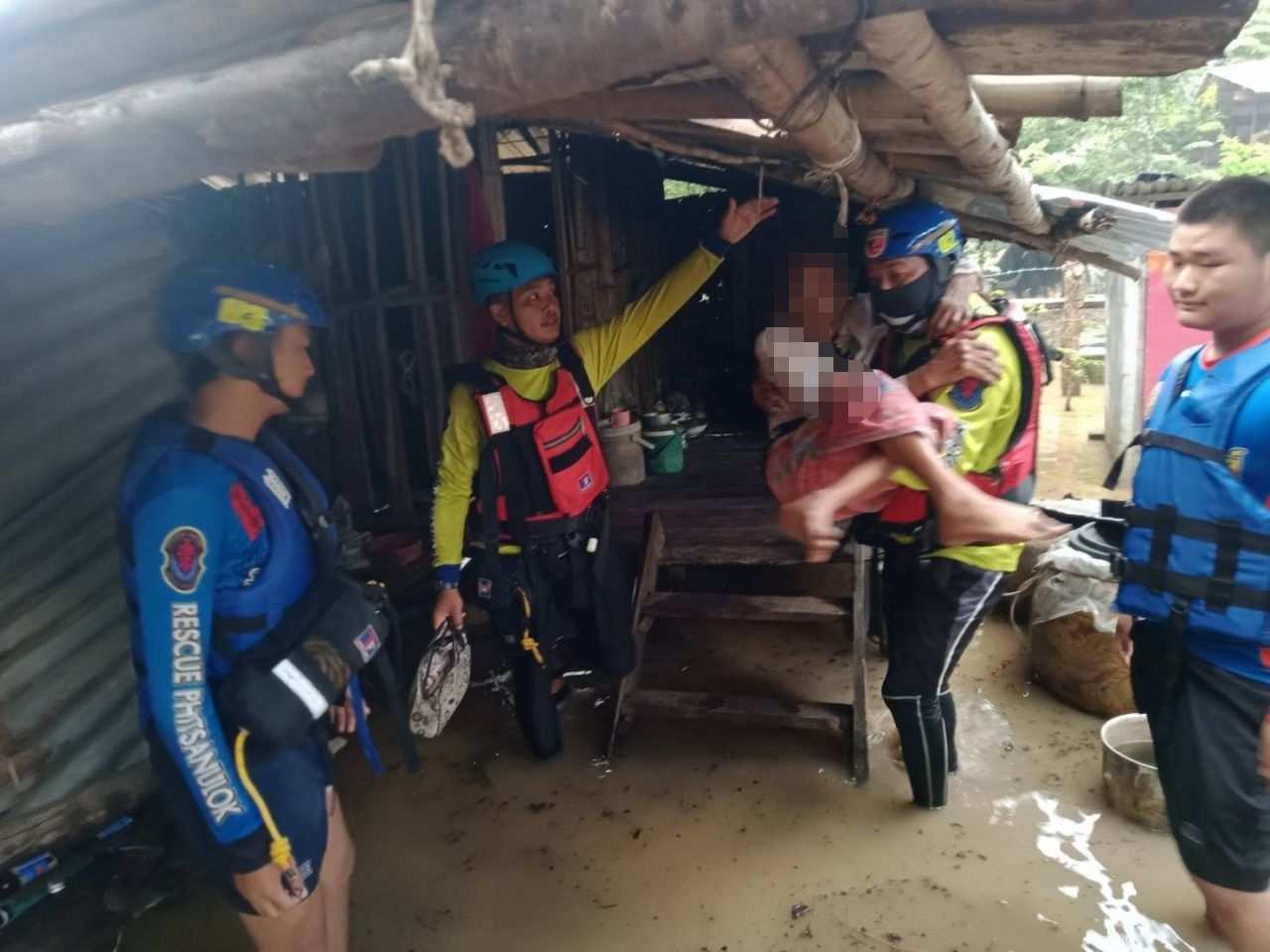 ในขณะที่ช่วงบ่ายพบว่าน้ำป่ายังไหลหลากเข้าสู่คลองในพื้นที่อย่างต่อเนื่อง ทำให้ระดับน้ำที่ท่วมในหลายพื้นที่เพิ่มขึ้นอย่างน้อย 10 ซม. ทางเจ้าหน้าที่หน่วยกู้ภัยพิษณุโลก มูลนิธิประสาทบุญสถาน ได้ลงพื้นที่เข้าช่วยเหลือประชาชนในพื้นที่ โดยเฉพาะ คุณยายป้อง ศรีผ่องใส อายุ 68 ปี ชาวบ้านหมู่ 7 ต.วังโพรง ที่พิการทางขาข้างซ้ายไม่สามารถเดินฝ่าน้ำท่วมได้ จึงตัดสินใจให้เจ้าหน้าที่กู้ภัย นำคุณยายป้อง ออกจากบ้านไปพักในที่ปลอดภัย เนื่องจากเกรงว่าในช่วงค่ำนี้ฝนอาจตกลงมาอีกทำให้เกิดอันตรายได้