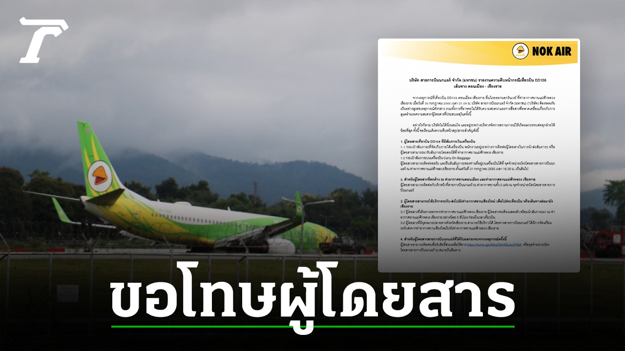 นกแอร์ ออกแถลงการณ์ขอโทษผู้โดยสารเที่ยวบิน DD108 เส้นทาง ดอนเมือง-เชียงราย ลื่นไถลออกนอกรันเวย์ ที่สนามบินแม่ฟ้าหลวง พร้อมอำนวยความสะดวกผู้โดยสารทุกคนที่ได้รับผลกระทบ