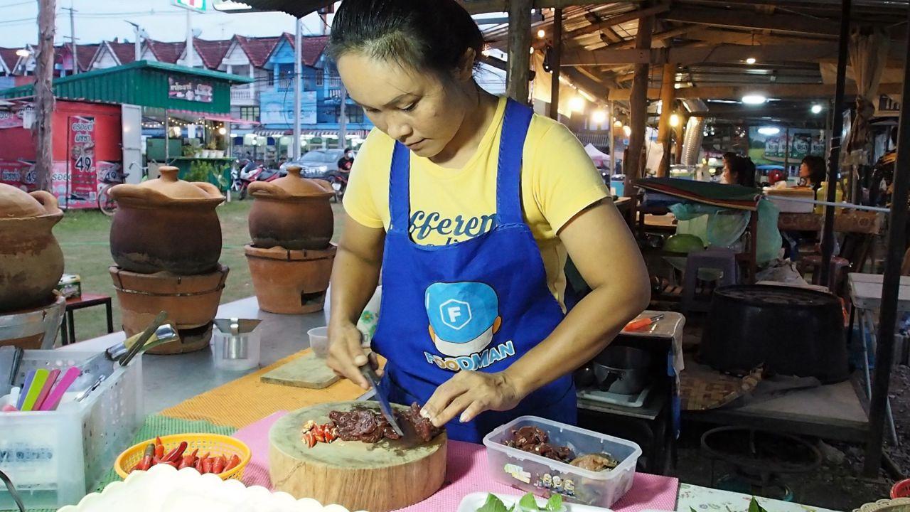 นางจิราภรณ์ ปิงสุแสน อายุ 37 ปี ชาวบ้านแช่แห้ง ม.6 ต.หย่วน อ.เชียงคำ จ.พะเยา แม่ค้าร้านหม้อดิน ในตลาด กาดไนท์พลาซ่าเชียงคำ เผยว่า ช่วงเวลานี้ เศรษฐกิจการค้าขายไม่ค่อยดี ลูกค้าลดลง วัตถุดิบต่างก็มีแต่ขึ้นราคา ทำให้ต้นทุนสูงมาก จึงคิดเมนูที่จะช่วยดึงลูกค้ามาจับจ่ายใช้สอยอย่างไรดี จึงผุดไอเดีย ซอยจุ๊เนื้อจัดทำเป็นถ้วยเล็กๆ แทนที่จะทำเป็นจานชุดละ 70 บาท ซึ่งลูกค้าบางรายมานั่งทานคนเดียวก็ทานไม่หมด ถ้าหากจัดทำเป็นชุดเล็กๆ เป็นชอต ชอตละ 5-10 บาท ให้ลูกค้ารับประทานได้ในราคาประหยัด