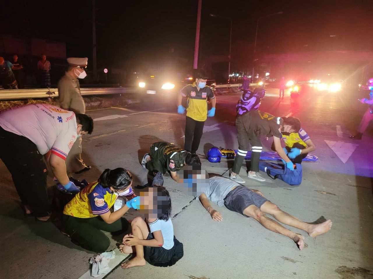 พ่อกับลูกสาว 7 ขวบขี่ จยย.ผ่านถนนไฟส่องสว่างชำรุดโดน จยย.วัยรุ่นที่ขี่มามองไม่เห็นเลยชนกระเด็นบาดเจ็บ 3 คน ลูกสาวหอบร่างมีแผลไปกอดพ่อร้องให้กู้ภัยช่วย หวิดโดนรถชนซ้ำ ก่อนนำส่ง รพ.ปลอดภัยแล้ว