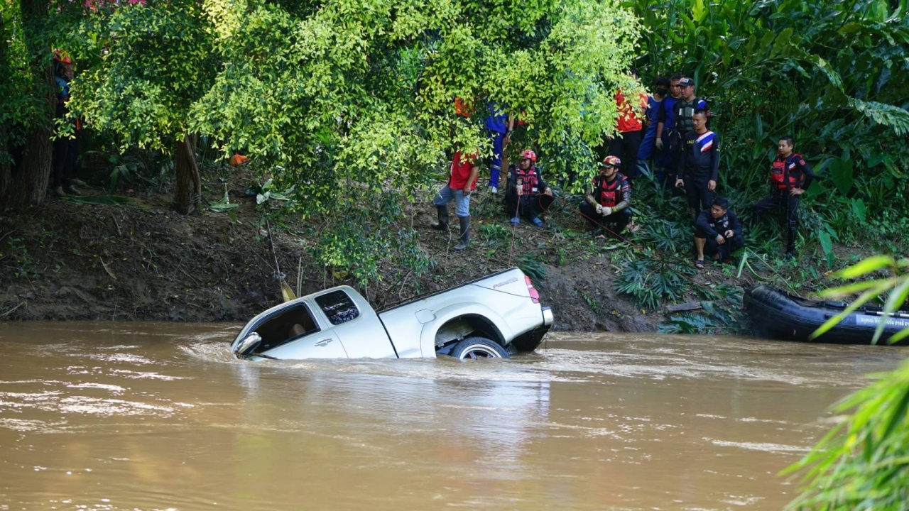 กระทั่งเช้าวันนี้ ชุดกู้ภัยฯสมาคมกุศลสงเคราะห์เชียงใหม่, ประน้ำภาค5, กู้ภัยฯพร้าววังหิน, ไมค์ มหาวงศ์ คนสู้ไฟ และกู้ภัยฯในพื้นที่ลงเรือท้องแบนและเรือยางออกค้นหา จนกระทั่งพบรถกระบะจมอยู่ใต้น้ำบริเวณด้านหลังสวนจริณรีสอร์ต จึงร่วมกันกู้รถกระบะขึ้นมาบนฝั่งได้สำเร็จ เป็นรถกระบะโตโยต้า วีโก้แชมป์ พรีรันเนอร์ ไม่ติดแผ่นป้ายทะเบียน
