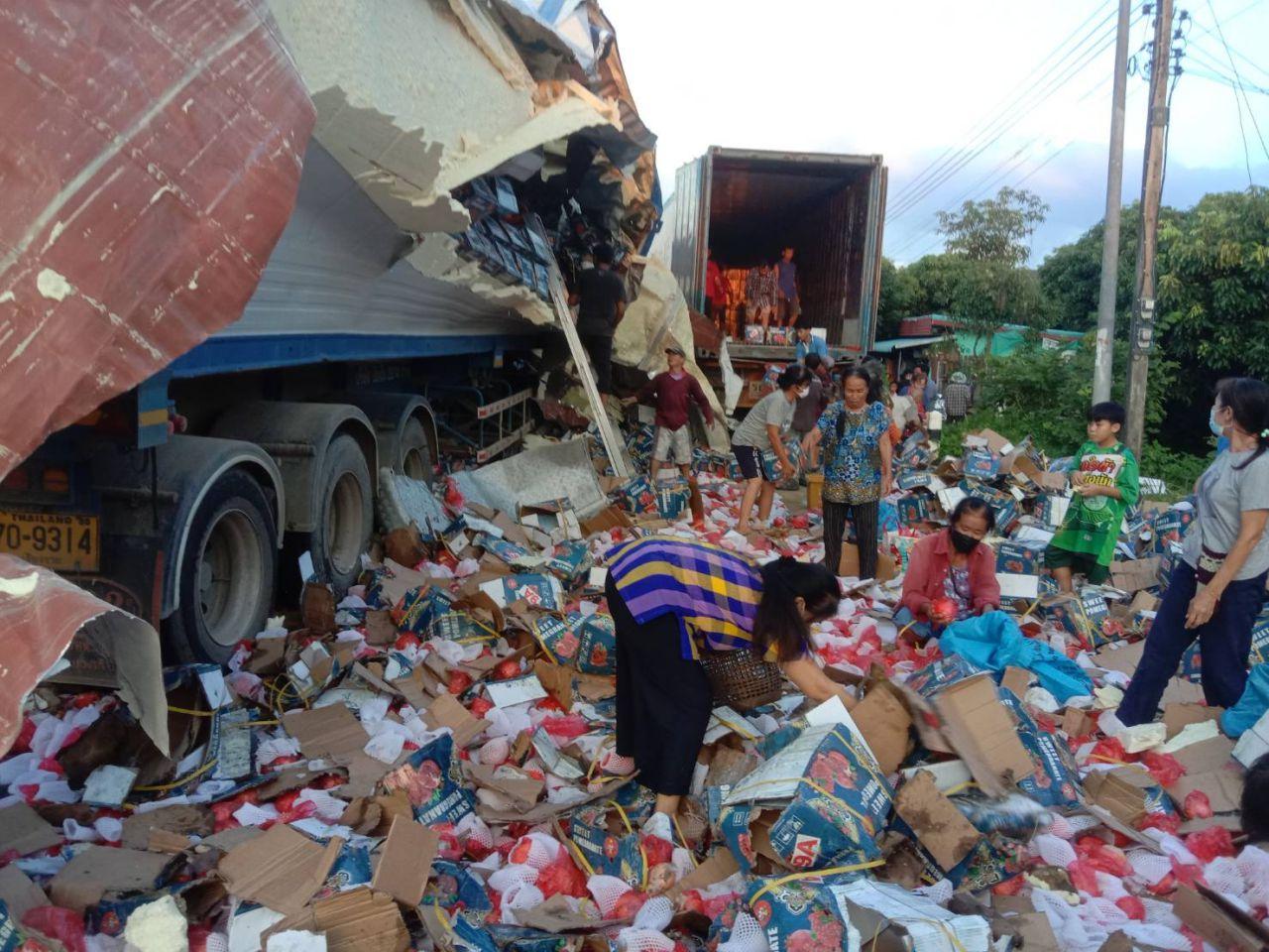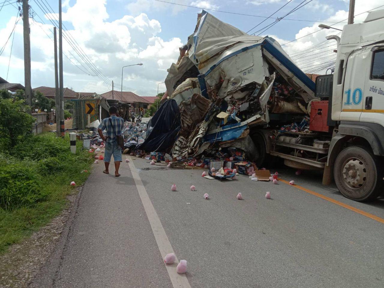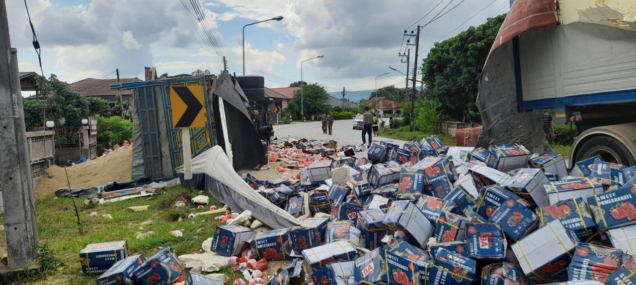 ส่วนรถพ่วง 22 ล้อลากตู้คอนเทนเนอร์ ทะเบียน 70-9313 เชียงราย บรรทุกผลไม้ตัวลูกพ่วงถูกชนกระแทกฉีกขาดพลิกคว่ำ ลูกแอปเปิ้ล ผลไม้ต่างๆ เทกระจาดกระจายเกลื่อนขวางเต็มถนน ทำให้รถสัญจรไปมาไม่ได้ ต้องปิดการจราจร ถึงค่ำยังไม่สามารถเปิดการจราจรได้ เจ้าหน้าที่ตำรวจต้องอำนวยความสะดวกทางด้านจราจร จัดให้รถยนต์ที่ใช้เส้นทางนี้เลี่ยงออกไปใช้เส้นทางสายบ้านใหม่ใต้ – สันมะค่า และเร่งเจ้าของรถนำรถบรรทุกมาขนถ่ายสินค้าออกจากถนน พร้อมกับยกรถพ่วง ทั้ง 2 คัน ออกจากถนน เพื่อเปิดทางการจราจร รวมใช้เวลานานกว่า 5 ชั่วโมง