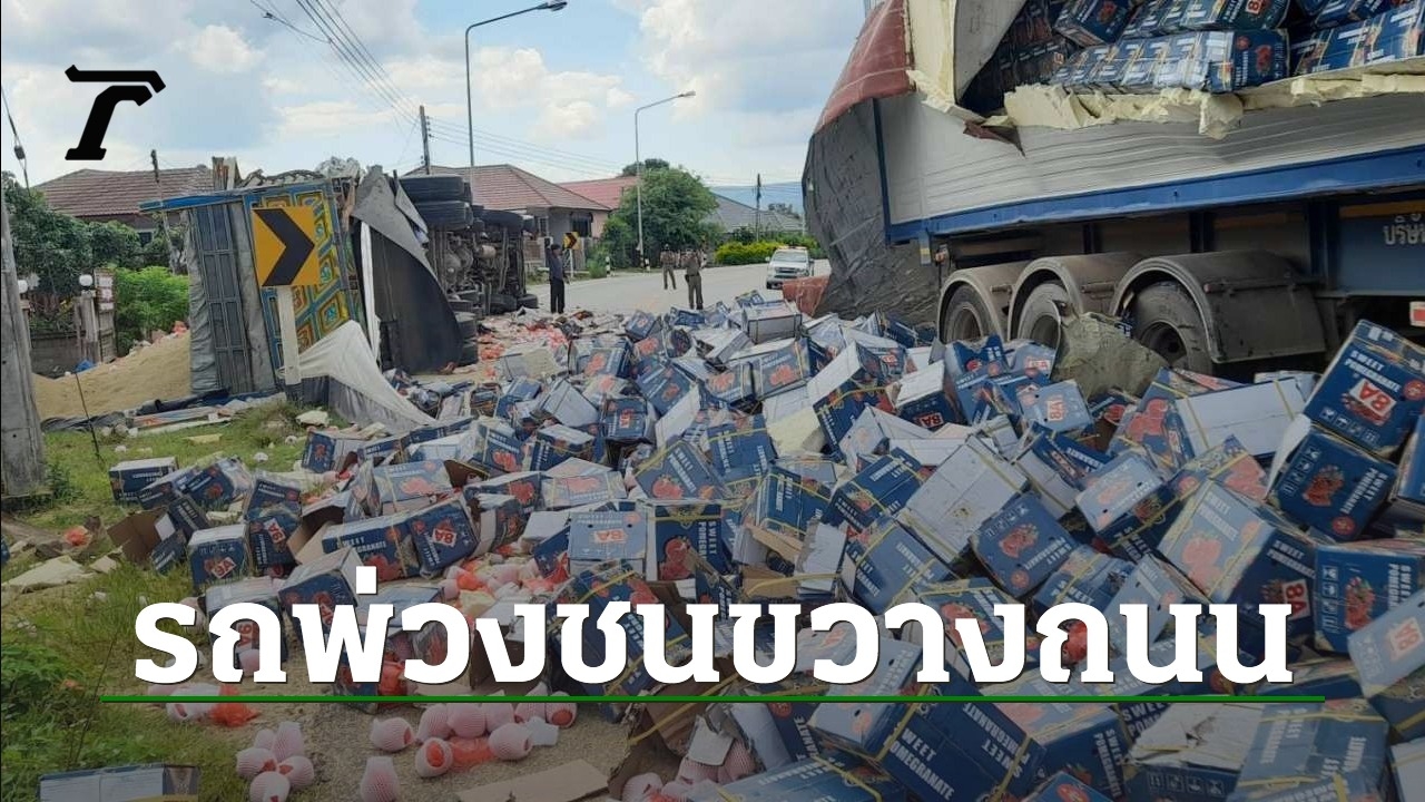 รถพ่วงบรรทุกผลไม้ชนกับรถพ่วงบรรทุกข้าวเปลือก ตรงทางโค้งบนถนนสาย อ.จุน จ.พะเยา - อ.ป่าแดด จ.เชียงราย คว่ำปิดถนน ในพื้นที่ บ้านใหม่ใต้ จ.เชียงราย จนต้องปิดถนนนาน 5 ชม.เพื่อเคลียร์เส้นทาง
