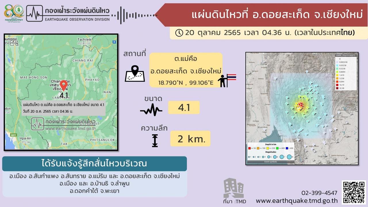 กองเฝ้าระวังแผ่นดินไหว กรมอุตุนิยมวิทยา รายงานในวันพฤหัสบดีที่ 20 ต.ค. 2565 ว่า เมื่อเวลาประมาณ 4.36 น. ที่ผ่านมา เกิดแผ่นดินไหว จุดศูนย์กลางอยู่บริเวณ ต.แม่คือ อ.ดอยสะเก็ด จ.เชียงใหม่ ที่ละติจูด 18.790 องศาเหนือ ลองจิจูด 99.106 องศาตะวันออก ขนาด 4.1 ความลึก 2 กม.