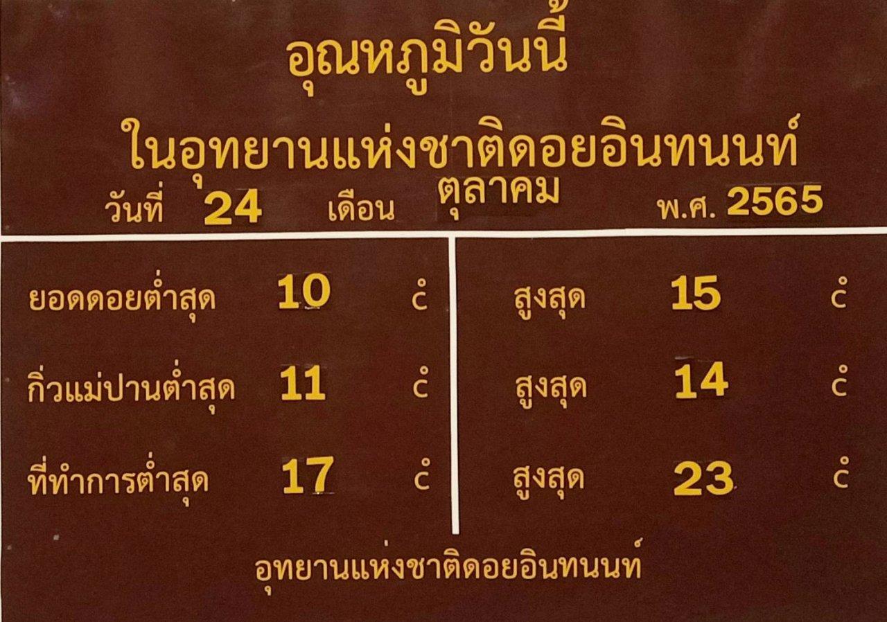 เมื่อเวลา 07.00 น. วันที่ 24 ต.ค. 65 นายเกรียงไกร ไชยพิเศษ หัวหน้าอุทยานแห่งชาติดอยอินทนนท์ อ.จอมทอง จ.เชียงใหม่ แจ้งว่า เช้าวันนี้อากาศเปิดแล้วหลังจากที่ก่อนหน้านี้อากาศปิดมาตลอด ทำให้นักท่องเที่ยวหมดหวังที่จะชมแสงแรกของวัน หรือพระอาทิตย์ยามเช้า โดยเฉพาะที่จุดชมวิวกิ่วแม่ปาน แต่มาวันนี้อากาศโล่งโปร่ง ท่ามกลางอากาศหนาวเย็น โดยอุณหภูมิวัดได้วันนี้ต่ำสุด 10 องศาฯ ที่ยอดดอย กิ่วแม่ปาน 11 องศาฯ และที่ทำการอุทยาน 17 องศาฯ