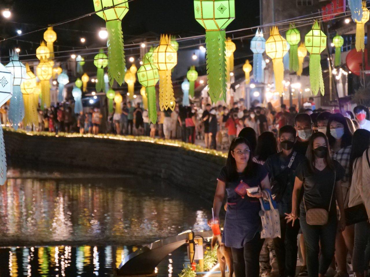 เมื่อวันที่ 4 พ.ย. 2565 ผู้สื่อข่าวรายงานบรรยากาศยามค่ำคืนในตัวเมืองเชียงใหม่ เวลานี้เต็มไปด้วยความคึกคัก ต้อนรับประเพณีเดือนยี่เป็ง ที่เริ่มขึ้นวันนี้เป็นวันแรก (4-9 พฤศจิกายน) หลายจุดทั่วเมืองเต็มไปด้วยแสงไฟจากโคมล้านนาที่ถูกนำมาประดับตกแต่ง ที่ลานอเนกประสงค์ประตูท่าแพ กลางเมืองเชียงใหม่ นักท่องเที่ยวทั้งชาวไทยและต่างชาติต่างพากันออกมาเดินเที่ยวชมและถ่ายภาพกับประติมากรรมโคมไฟ และซุ้มโคมล้านนาที่นำมาตกแต่งบนลาน ภายใต้แนวคิด ‘แสงศิลป์ประทีปเบิกฟ้า ยี่เป็งเชียงใหม่’ เพื่อต้อนรับประเพณียี่เป็งในปีนี้