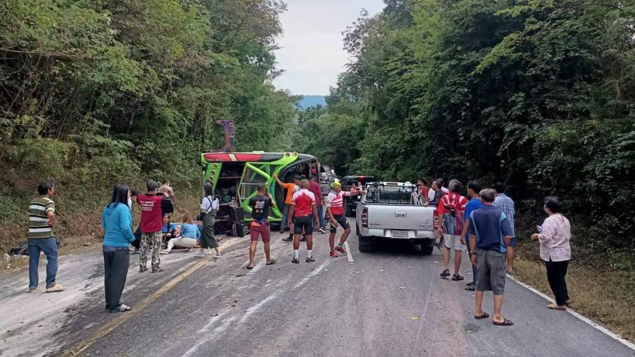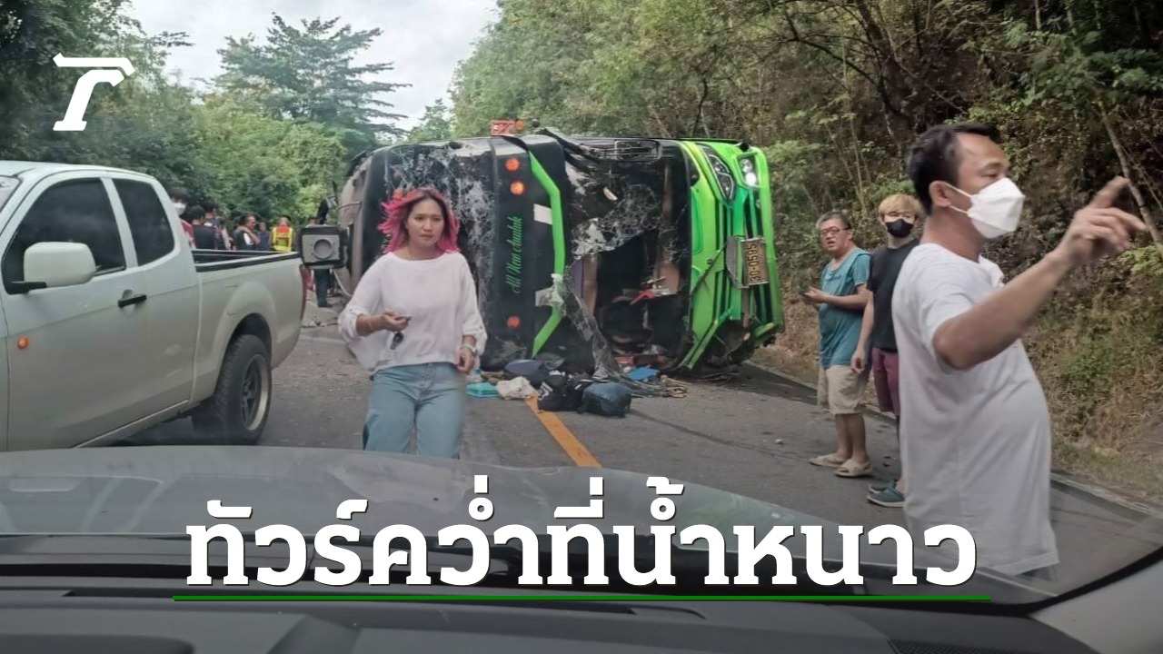รถทัวร์นำกลุ่มสตรีฯ จากมหาสารคาม มาเที่ยวเขาค้อเพชรบูรณ์ ขากลับขณะลงเขาช่วง อ.น้ำหนาว เกิดเสียหลักพลิกคว่ำหมุน 2 รอบ คาดเบรกมีปัญหา ผู้โดยสารบาดเจ็บ 46 คน ส่วนคนขับเสียชีวิตคาที่