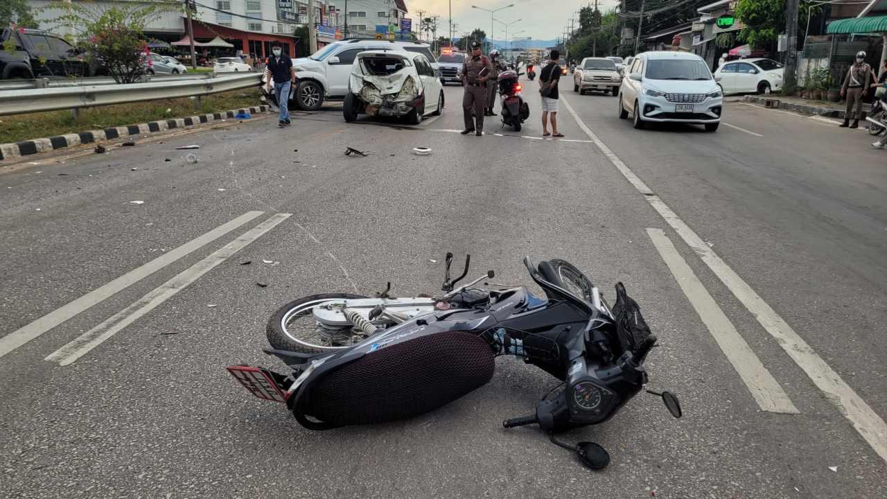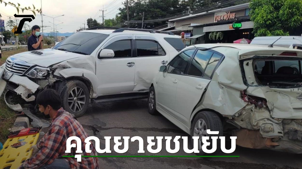 อุทาหรณ์ คุณยายวัย 74 ปีขับรถเก๋งเกียร์ออโต้ถอยหลังขึ้นเนินออกจากบ้าน เกิดตกใจ ขับพุ่งถอยหลังออกถนนสายหลักชนรถจักรยานยนต์หนุ่มเมียนมาร่างลอยกระเด็น ก่อนมีรถฟอร์จูนเนอร์ชนซ้ำระเนระนาด 3 คัน บาดเจ็บสาหัส 1 คาดคุณยายลืมเบรก