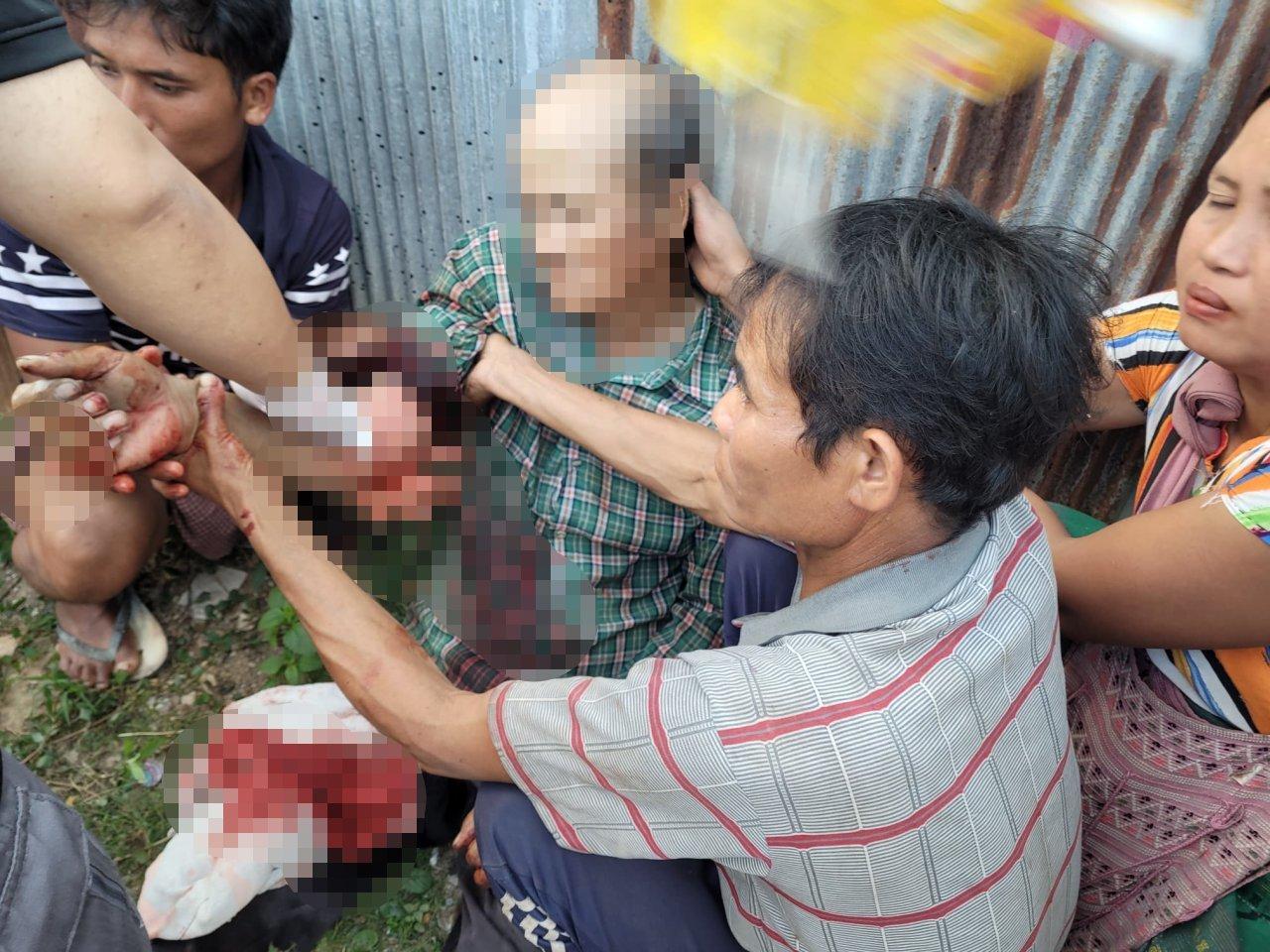 เมื่อตรวจสอบร่างกายของนายจันทร์ทิพย์ ที่บริเวณท่อนแขนขวาพบมีบาดแผลถูกใบเจียรเหล็กบาดเป็นแผลลึกฉกรรจ์ เสียเลือดมาก นั่งหายใจรวยริน โดยมีชาวบ้านหลายคนใช้ผ้ามามัดปิดบาดแผล เพื่อช่วยห้ามเลือดแต่เลือดก็ยังไหลไม่หยุด จนผู้ได้รับบาดเจ็บหวิดสลบ ชาวบ้านต้องตะโกนเรียกชื่อคนเจ็บอยู่ตลอดเวลา ต่อมาทีมกู้ชีพได้เดินทางมาถึงแล้วรีบกันชาวบ้านออก พร้อมรีบเข้าไปปฐมพยาบาลเบื้องต้น แล้วรีบนำตัวผู้ได้รับบาดเจ็บขึ้นรถยนต์กู้ชีพเร่งรีบนำตัวส่งโรงพยาบาลแม่สอด เพื่อให้แพทย์เร่งช่วยชีวิตอย่างเร่งด่วน