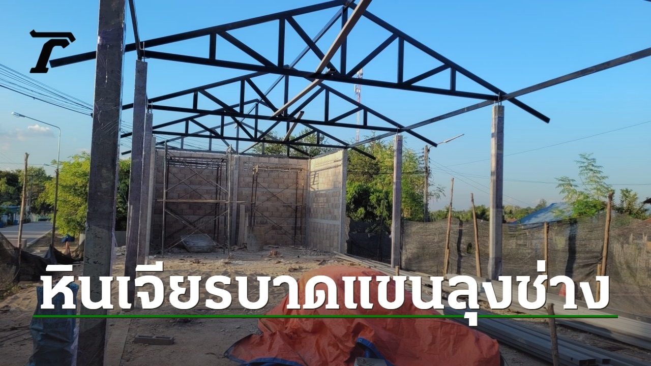 เมื่อนายช่างรุ่นพ่อขึ้นนั่งร้านทำงานต่อเติมหลังคาชุมชน เกิดพลาดใบหินเจียรแตกกระเด็นตัดแขนตนเองหวิดขาด เลือดไหลเต็มตัวอาการสาหัส ติดค้างนั่งร้าน ชาวบ้านต้องระดมมาช่วยชีวิตริมถนนสุดระทึกติดถนนเลียบแนวชายแดนอำเภอแม่สอด จังหวัดตาก
