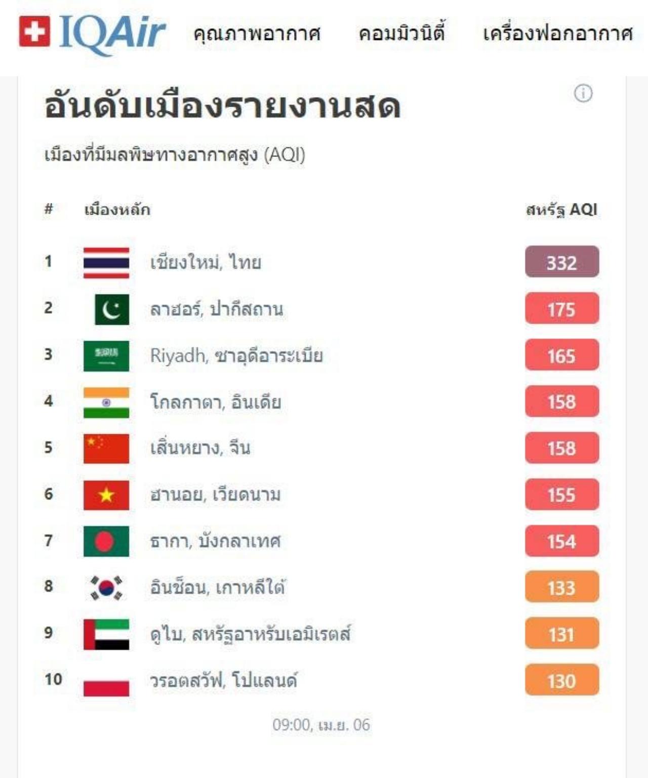 ทั้งนี้ เว็บไซต์ Iqair.com ซึ่งรายงานคุณภาพอากาศจากทั่วโลก แจ้งผลการตรวจวัดคุณภาพอากาศและการจัดอันดับเมืองที่มลพิษทั่วโลก เมื่อเวลา 09.00 น. ของวันที่ 6 เมษายน 2566 พบว่าจังหวัดเชียงใหม่มีดัชนีคุณภาพอากาศอยู่ที่ 332 US AQI และค่า PM 2.5 วัดค่าได้ 282.1 ไมโครกรัมต่อลูกบาศก์เมตร ซึ่งเกินค่ามาตรฐาน และอยู่ในระดับที่เป็นอันตราย โดยผลการตรวจวัดคุณภาพอากาศดังกล่าวพบว่าค่ามลพิษสูงสุดเป็นอันดับที่ 1 ของเมืองหลักที่มีมลพิษอากาศสูงสุดของโลก รองลงมา ได้แก่ อันดับ 2 เมืองลาฮอร์ ประเทศปากีสถาน ดัชนีคุณภาพอากาศ 175 US AQI, อันดับ 3 เมืองริยาด ประเทศซาอุดีอาระเบีย 165 US AQI, อันดับ 4 เมืองโกลกาตา ประเทศอินเดีย 158 US AQI และอันดับ 5 เมืองเสิ่นหยาง ประเทศจีน 158 US AQI