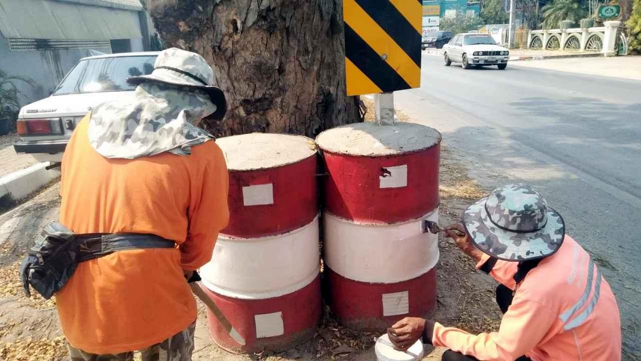 หมวดทางหลวงสันกำแพง ห่วงความปลอดภัยผู้ใช้รถใช้ถนนสายเชียงใหม่-สันกำแพง ในเวลากลางคืน ออกแก้ไขไฟกิ่ง และเอาถังยางมะตอยเก่ามาทาสีสะท้อนแสงตั้งตามโคนต้นไม้จามจุรี จนไม่มีอุบัติเหตุรถชนต้นไม้เลย