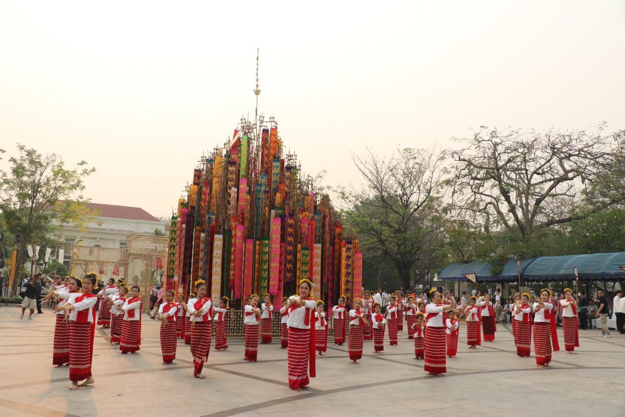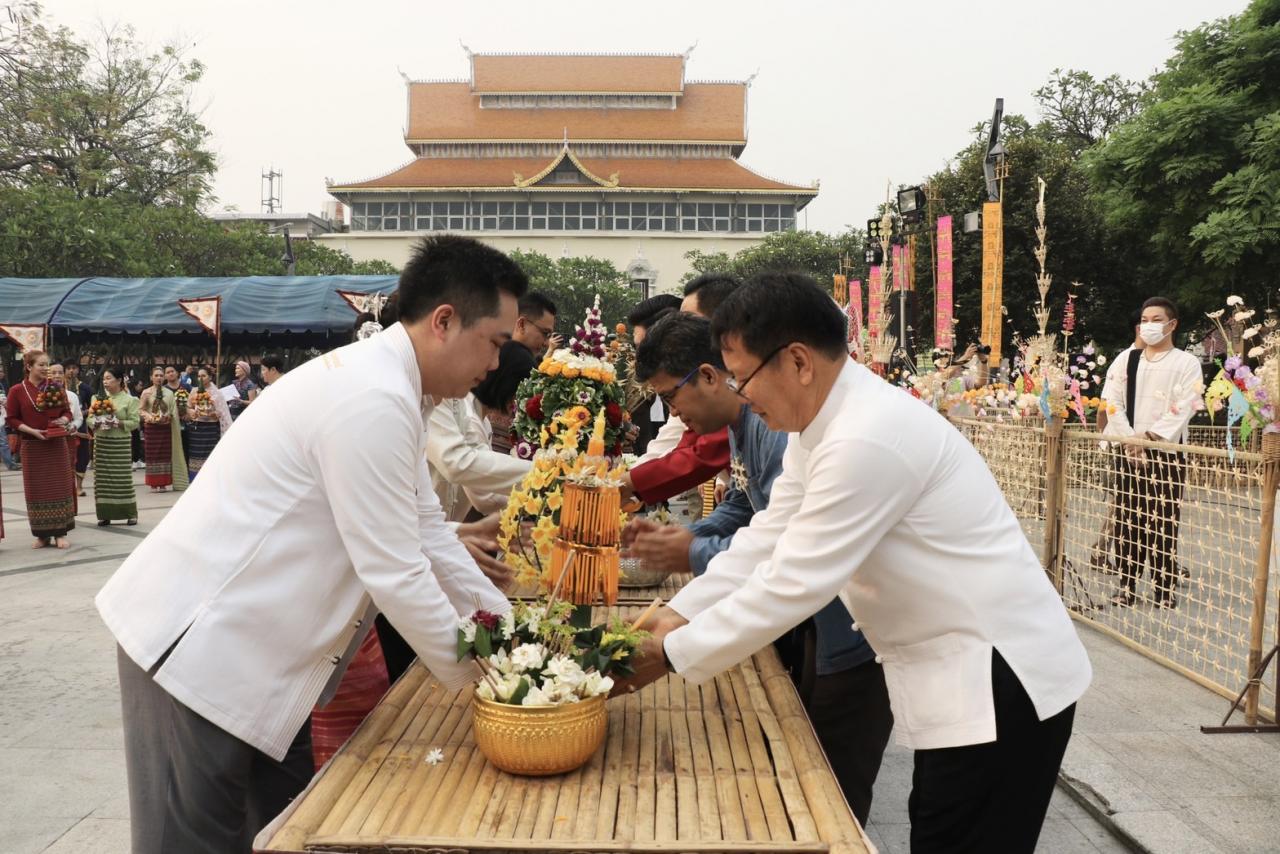 อีกทั้งยังเพื่อเป็นสิริมงคลให้กับตนเองและครอบครัวที่ได้เข้ามาสักการะให้มีความปลอดภัยมีความสุขในช่วงเทศกาลงานป๋าเวณีปี๋ใหม่เมืองเจียงใหม่ โดยมีขบวนอัญเชิญเครื่องสักการะตามประเพณีล้านนาทั้งหมกสุ่มมากเป็ง และขบวนวัฒนธรรม ทั้งขบวนช่างฟ้อนกว่า 500 คน อายุตั้งแต่ 4 ขวบจนถึงผู้สูงวัยอายุกว่า 80 ปี แต่งกายชุดพื้นเมืองทัดดอกเอื้องที่ผม สวมชุดพื้นเมืองร่วมเป็นจ้างฟ้อง หรือช่างฟ้องเล็บมาร่วมฟ้อนบวงสรวงในครั้งนี้ โดยขบวนแห่เครื่องสักการะมายังลานอนุสาวรีย์สามกษัตริย์ ก่อนที่จะทำพิธีถวายพวงมาลา และเครื่องบวงสรวงสักการะดวงพระวิญญาณกษัตริย์ผู้สร้าง และสถาปนาเมืองเชียงใหม่ โดยมีประชาชนชาวเชียงใหม่ และนักท่องเที่ยวเข้าร่วมพิธีจำนวนมาก
