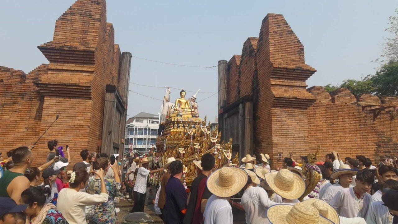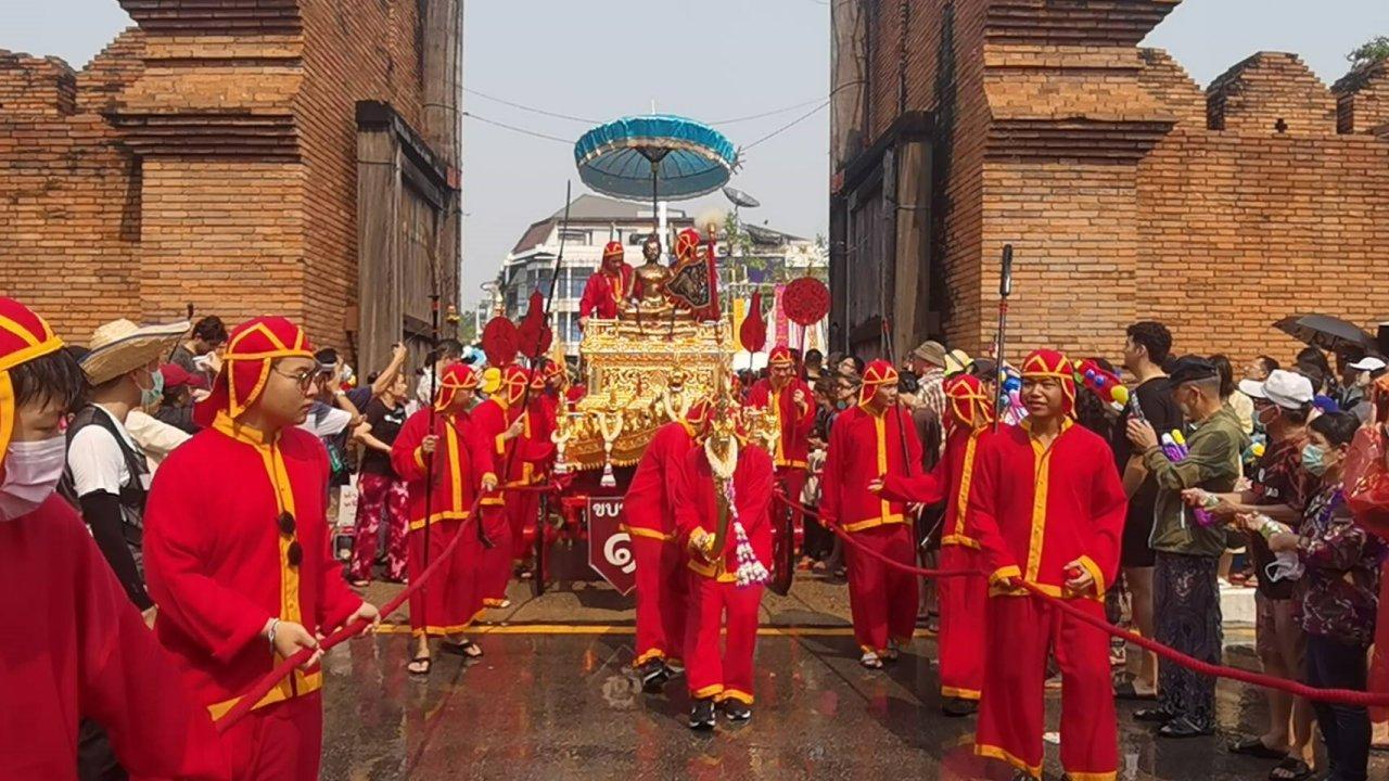 ขณะที่ในช่วงเวลา 14.09 น. ทางจังหวัดเชียงใหม่ได้มีการอัญเชิญพระพุทธสิหิงค์พระคู่บ้านคู่เมืองเชียงใหม่ขึ้นประดิษฐานบนรถบุษบก และพระพุทธรูปสำคัญจากวัดต่างๆในจังหวัดเชียงใหม่ทั้งหมด 54ขบวน เริ่มขึ้นขบวนจากถนนเจริญเมืองมาตามถนนช้างม่อยผ่านข่วงประตูท่าแพและถนนราชดำเนินให้ประชาชนและนักท่องเที่ยวได้สรงน้ำพระเพื่อความเป็นสิริมงคล ซึ่งตลอดเส้นทางที่ขบวนได้เคลื่อนผ่าน มีประชาชนและนักท่องเที่ยวจำนวนมากต่างมาเฝ้ารอสรงน้ำพระกันตลอดสองข้างทาง
