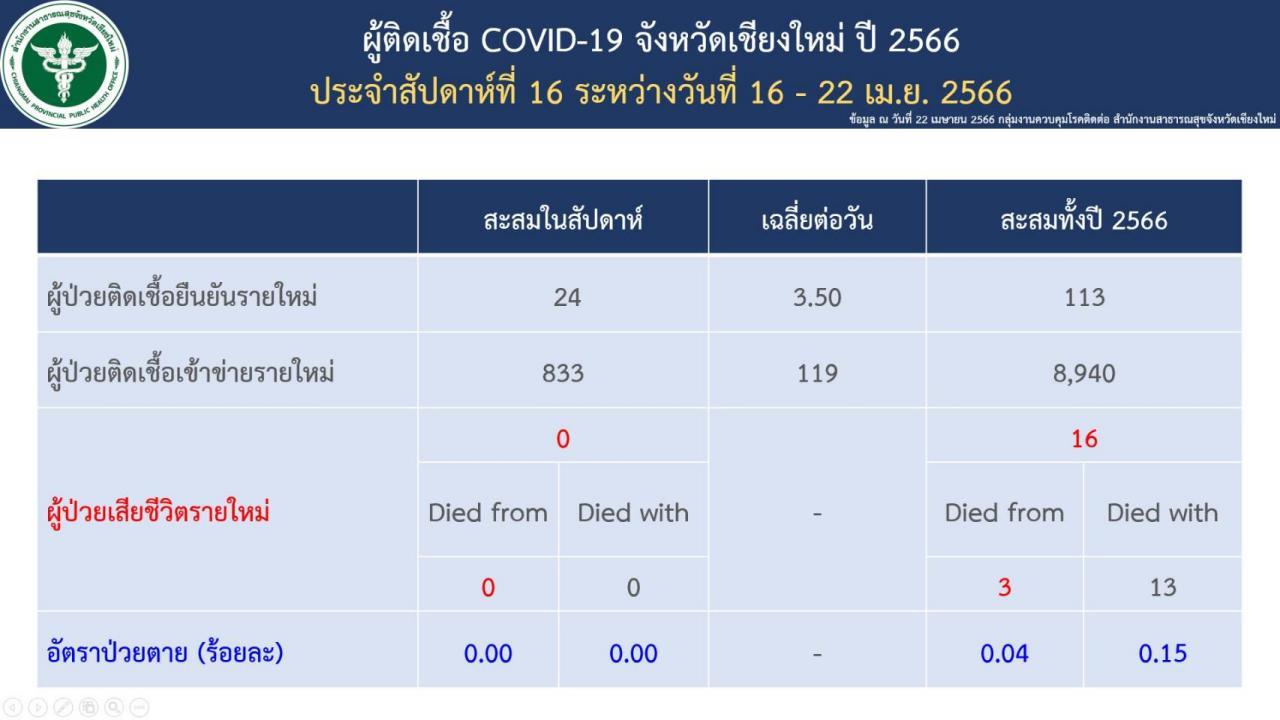 ข้อมูลจากสำนักงานสาธารณสุขจังหวัดเชียงใหม่ ระบุในช่วงวันที่ 16-22 เมษายน พบผู้ป่วยติดเชื้อโควิด-19 ยืนยันรายใหม่ 24 ราย และ ผู้ป่วยติดเชื้อเข้าข่ายรายใหม่ (ตรวจจากชุดเอทีเค) 833 ราย หรือ เฉลี่ยวันละ 119 ราย และพบผู้เสียชีวิต 1 ราย