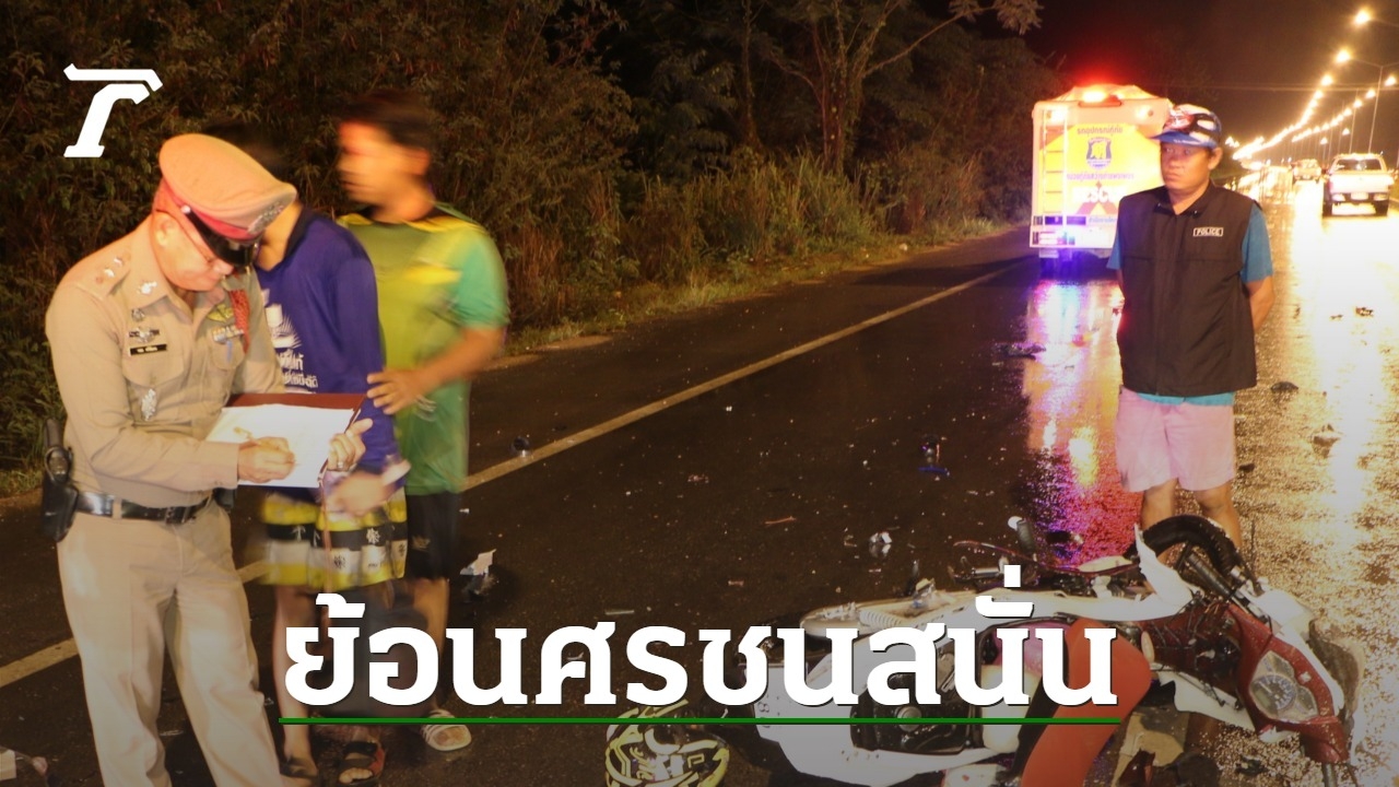 สาว 24 เคราะห์ร้าย ขับ จยย.ตามทางปกติ ถูก จยย.อีกคันขับย้อนศรชนสนั่น กระเด็นทั้งคู่ สลด สาว 24 ดับ ส่วนคนขับ จยย.อีกคันบาดเจ็บสาหัส เผยก่อนเกิดเหตุมีฝนตกลงมา คาดถนนอาจลื่น-เบรกไม่ทันด้วย