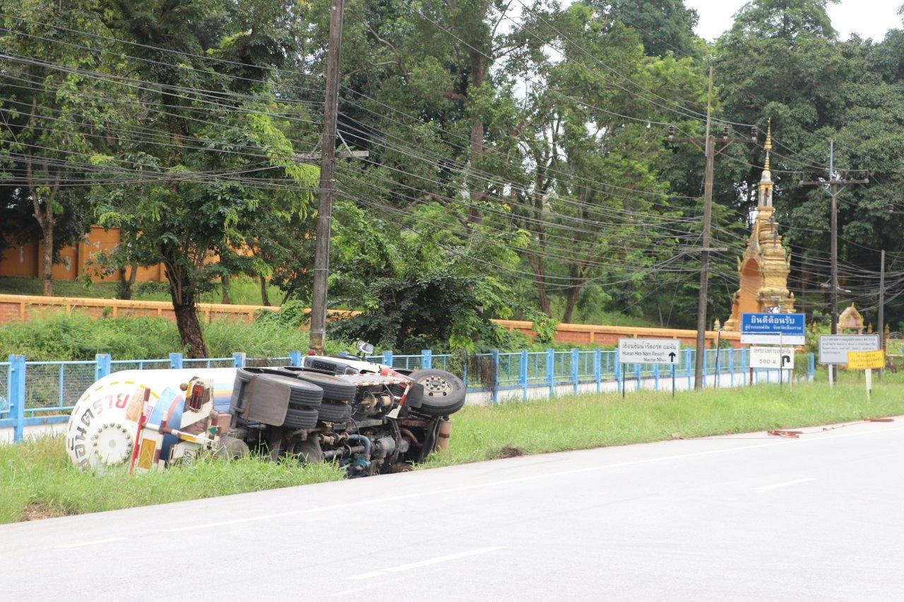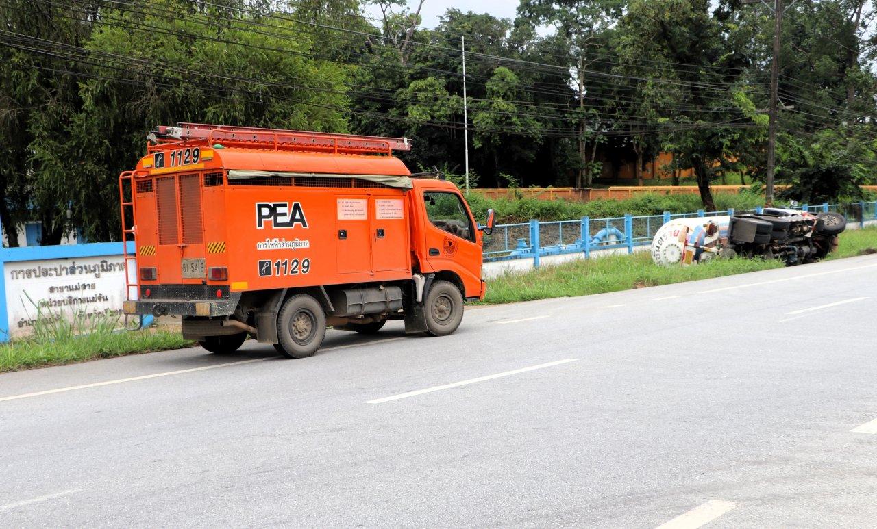 รถบรรทุกแก๊สพลิกตรงข้ามปั้มแก๊ส ริมถนนพหลโยธินขาขึ้นหน้าที่ว่าการประปาแม่จัน จ.เชียงราย จนท.ปภ.และกู้ภัยต้องปิดกั้นพื้นที่ เรียกรถน้ำมาระดมฉีดเลี้ยงไว้ พร้อมเตรียมทีมผจญเพลิงหากมีการระเบิด ก่อนจะประสานรถเครนใหญ่ ยกขึ้นมาบนถนนได้อย่างปลอดภัย