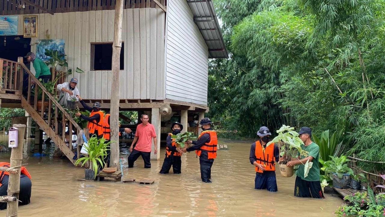 ขณะเดียวกันฝนที่ตกหนักต่อเนื่อง ยังส่งผลทำให้แม่น้ำเมยเอ่อล้นเข้าท่วมบ้านเรือนประชาชน ในหมู่บ้านวังผา หมู่ที่ 4 ตำบลแม่จะเรา อำเภอแม่ระมาด จังหวัดตาก เจ้าหน้าที่กองร้อยทหารพรานที่ 3506 พร้อมเทศบาลทุ่งหลวง ต้องนำเรือเข้าไปช่วยเหลือชาวบ้านที่มีบ้านเรือนสร้างติดกับตลิ่งริมแม่น้ำเมย โดยแม่น้ำเมยล้นได้ทะลักเข้าท่วมบ้านเรือนประชาชนแบบฉับพลันหลายหลังคาเรือน ทหารพรานต้องระดมกำลังพลเข้าไปช่วยขนย้ายสิ่งของในบ้านเรือนประชาชนหนีน้ำ นำไปไว้ในพื้นที่ปลอดภัย