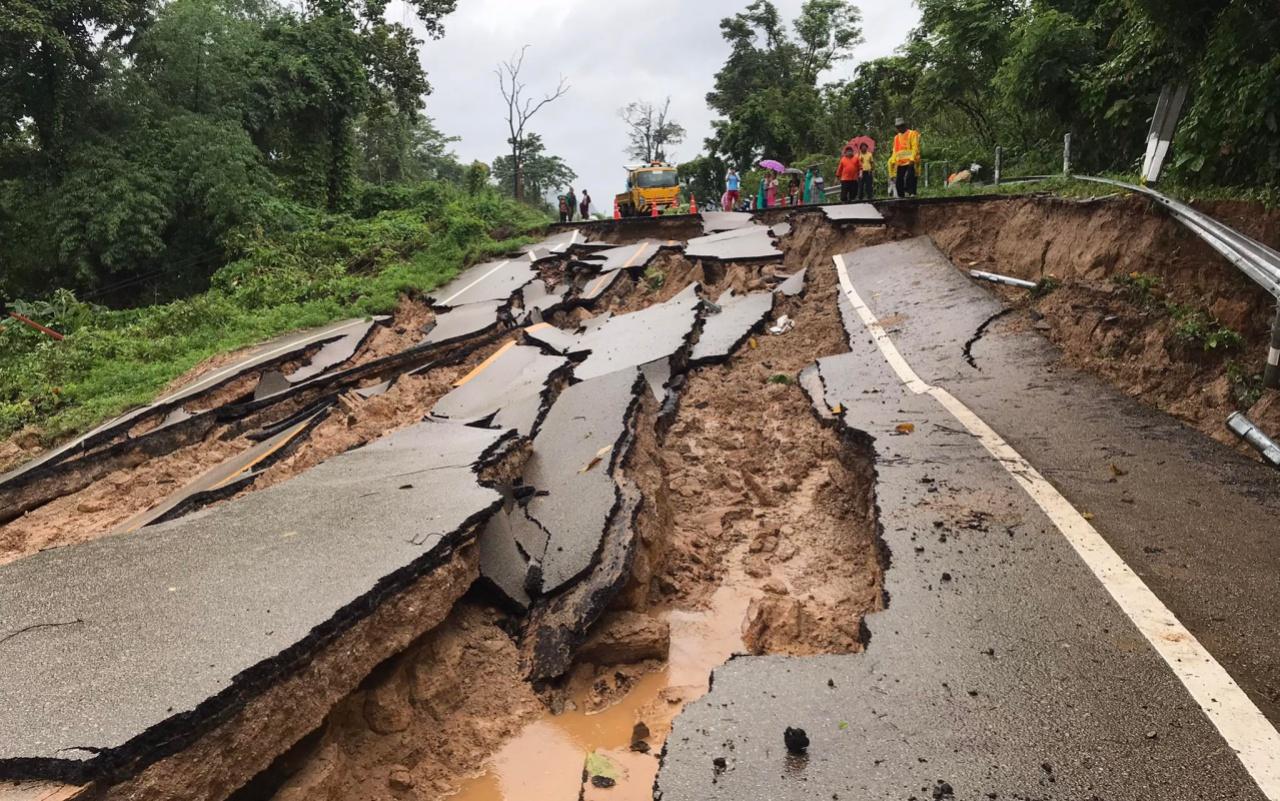 วันที่ 7 ส.ค. 66 ตลอดทั้งคืนที่ผ่านมาล่วงเลยถึงช่วงเช้า ได้มีพายุเข้า ฝนตกหนักไม่หยุดนานหลายชั่วโมง ในพื้นที่ชายแดนอำเภอท่าสองยาง จังหวัดตาก ตรวจวัดปริมานน้ำฝนได้ 90-100 มิลลิเมตรต่อวัน และเป็นฝนที่ตกต่อเนื่องมานานกว่า 1 สัปดาห์แล้ว โดยช่วงเช้าวันนี้มีรายงานว่าเส้นทางหลวงแผ่นดินหมายเลข 105 ถนนสายแม่สอด-แม่สะเรียง ช่วงบ้านแม่ตะวอ หมู่ที่ 1 ไปบ้านแม่จวาง หมู่ 8 อำเภอท่าสองยาง จังหวัดตาก ช่วงหลักกิโลเมตรที่ 149 ผิวการจราจรเกิดทรุดตัวพังทลาย เป็นระยะทางยาวมากกว่า 50 เมตร ลึกกว่า 1 เมตร และไหล่ทางซึ่งเป็นไหล่ทางภูเขา เกิดดินสไลด์ตัวเป็นแนวลึก และทำให้ผิวการจราจรทรุดตัวไปพร้อมกันด้วย ซึ่งรอยแตกบนผิวถนนในจุดเกิดเหตุค่อนข้างลึกจนน่ากลัวและเสี่ยงอันตราย เนื่องจากรอยทรุดตัวมีความลึกมาก และขยายแนวเพิ่มมากขึ้นหลังฝนยังคงตกต่อเนื่อง