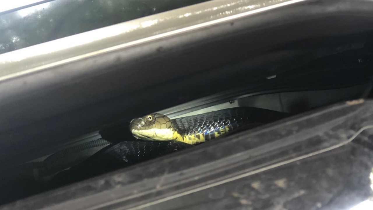 พบเป็นบ้านของ นายจรัน ศรีมุข อายุ 46 ปี และ นางเยาวลักษณ์ ศรีมุข อายุ 44 ปี ในรถกระบะโตโยต้า วีโก้ แค็บ สีบรอนซ์ ป้ายทะเบียน บย 9215 กำแพงเพชร จอดอยู่ในโรงรถข้างบ้าน ในฝากระโปรงหน้ารถพบ งูจงอาง เลื้อยเข้าไปขดตัวในฝากระโปรงบริเวณห้องเครื่อง และชูคอออกมาขู่ เจ้าหน้าที่กู้ภัยได้ใช้เวลากว่า 20 นาที ในการดึงงูจงอางออกมาจากฝากระโปรงหน้ารถ โดยพยายามทำให้งูจงอางหมดแรง เพื่อที่จะจับได้ง่าย เพราะงูจงอางตัวใหญ่ มีแรงมาก