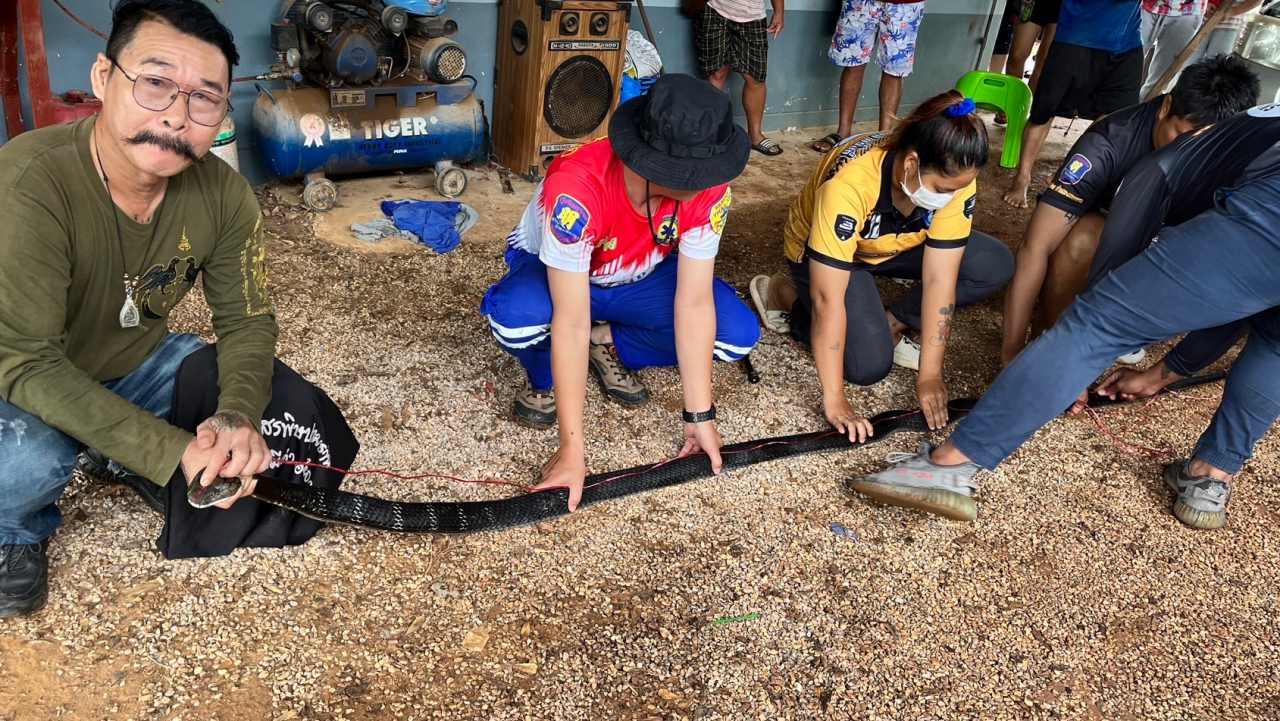เมื่อนำออกมาได้สำเร็จ วัดขนาดความยาวได้ 3.34 เมตร เป็นเพศเมีย โดยงูจงอางตัวดังกล่าวมีขนาดใหญ่ สีดำลาย เห็นแล้วขนลุก จากนั้นเจ้าหน้าที่กู้ภัยได้จับใส่ถุงเพื่อนำไปปล่อยคืนสู่ธรรมชาติ ห่างไกลจากบ้านคน