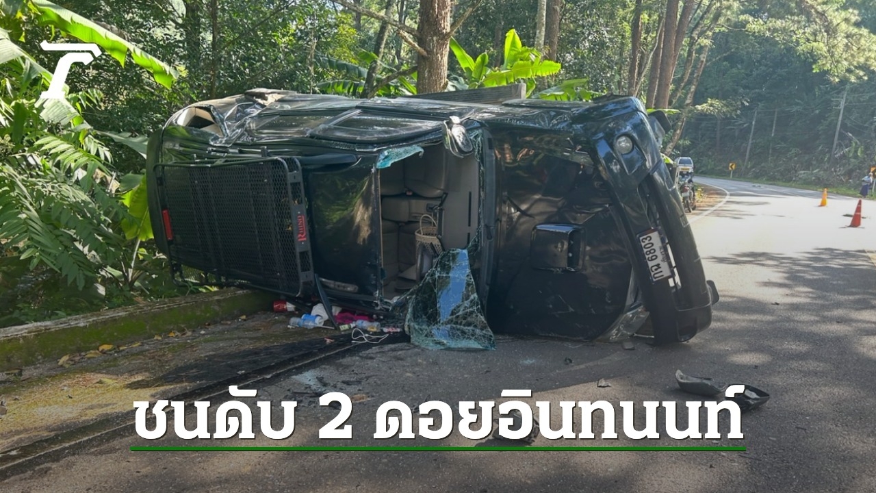 รถกระบะตู้ทึบเสร็จจากส่งของ วิ่งลงดอยอินทนนท์ ถึงทางโค้งอันตรายที่เคยเกิดอุบัติเหตุมีคนตาย 5 ศพ เมื่อปี 63 เกิดเสียหลักชน จยย.ดับ 2 ศพ และยังชนรถฟอร์จูนเนอร์นักท่องเที่ยวบาดเจ็บ 1 รถกระบะพุ่งตกเหว คนขับบาดเจ็บ