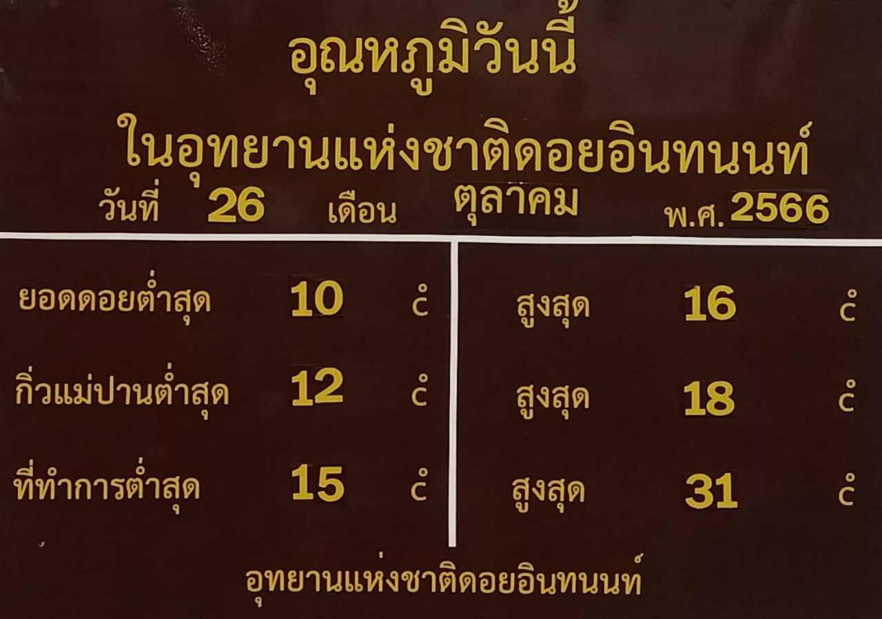 เช้าวันที่ 26 ต.ค. 66 บรรยากาศการท่องเที่ยวบนยอดดอยอินทนนท์ อำเภอจอมทอง จังหวัดเชียงใหม่ กลับมาคึกคักอีกครั้ง เนื่องจากสภาพพื้นที่ป่าเขาเขียวขจี อีกทั้งช่วงปลายฝนต้นหนาวนี้เป็นที่นิยมชมชอบของบรรดานักท่องเที่ยวที่ต้องการขึ้นมาสัมผัสไอหมอกที่ลอยปะทะกับใบหน้า พร้อมชมพระอาทิตย์ขึ้นยามเช้า ทอแสงสีทองตัดกับภูเขาที่เขียวขจีสุดลูกหูลูกตา แม้ว่าจะยังไม่เข้าสู่ฤดูหนาวอย่างเป็นทางการ แต่สภาพอากาศบนยอดดอยหนาวเย็น โดยอุณหภูมิบนยอดดอยวัดได้ 10 องศาเซลเซียส ขณะที่จุดชมวิวกิ่วแม่ปานวัดได้ 12 องศาเซลเซียส