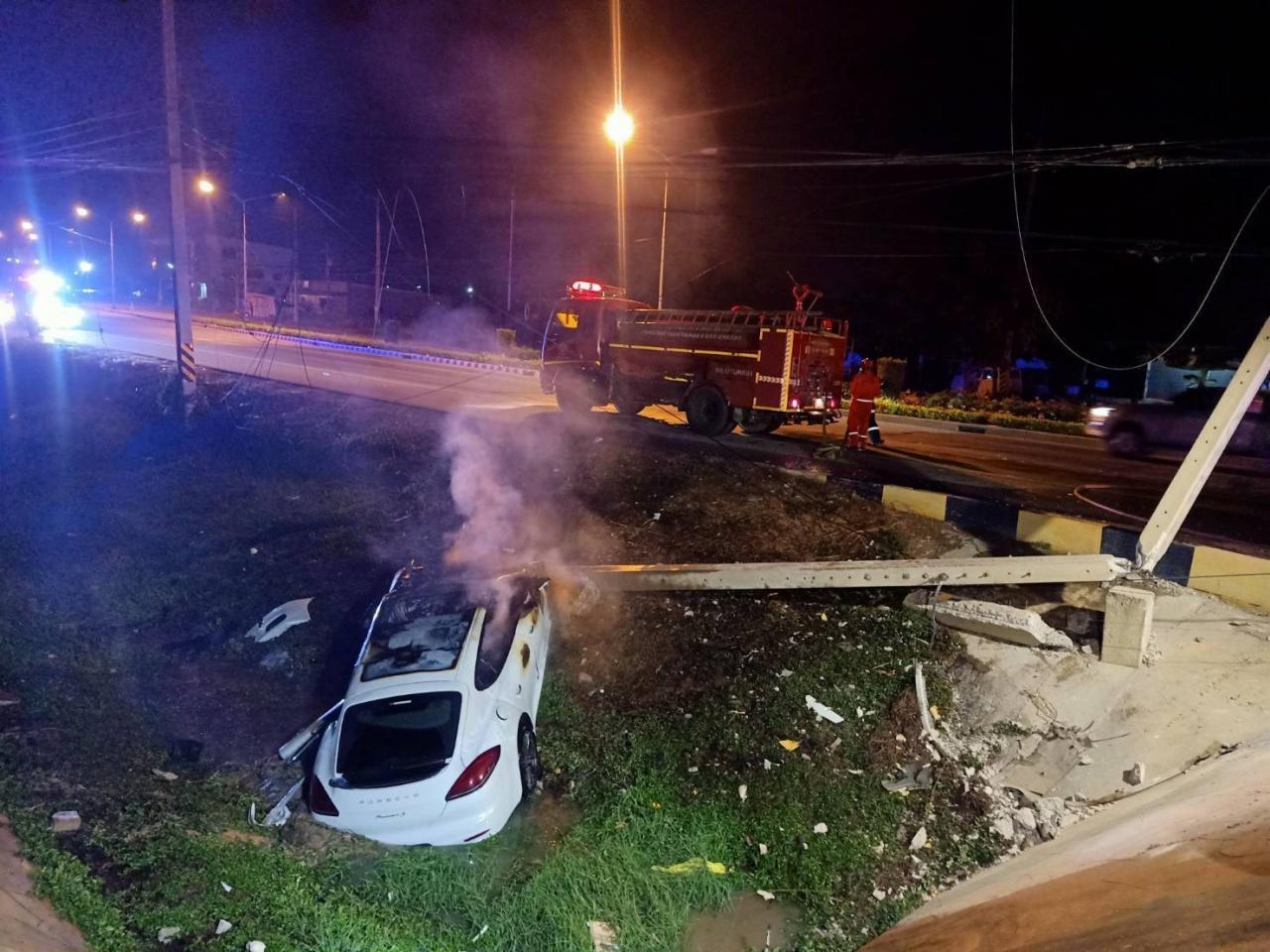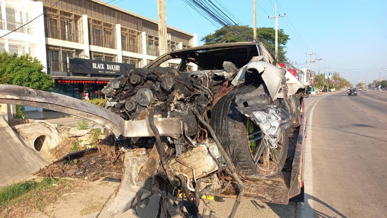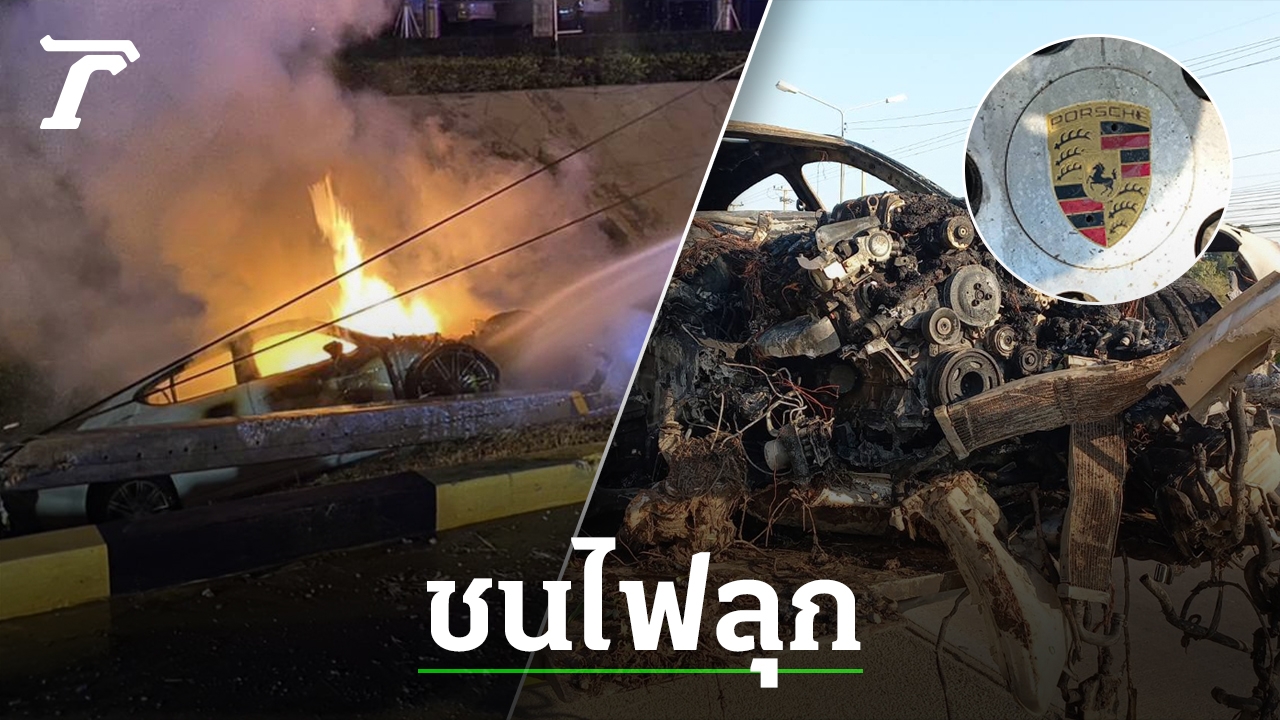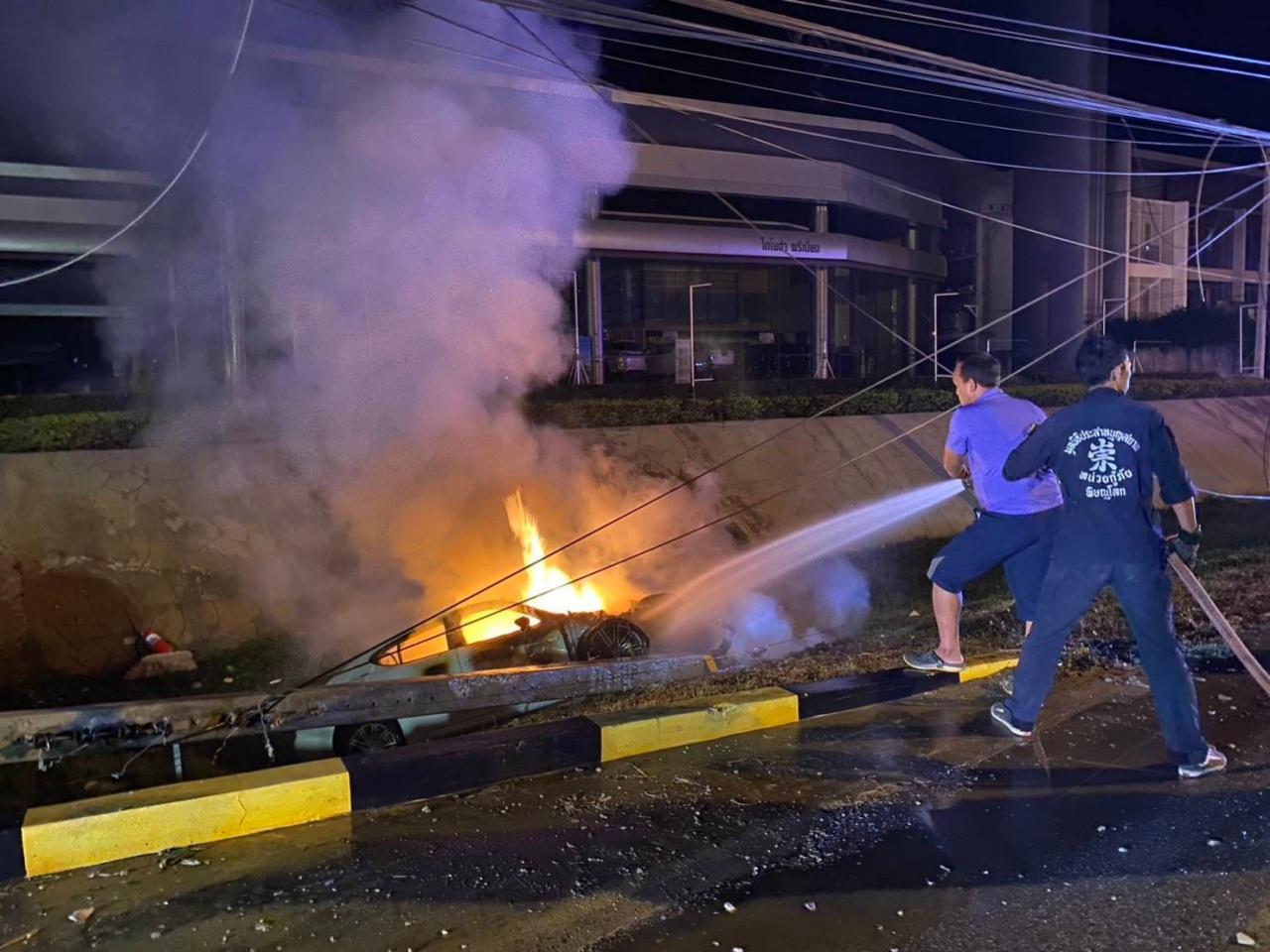 พิษณุโลก-อุบัติเหตุรถหรูปอร์เช่ แหกโค้ง พุ่งชนเสาไฟฟ้าหัก ไฟลุกไหม้เสียหายทั้งคัน ตำรวจอยู่ระหว่างติดตามหาตัวเจ้าของรถ เพื่อดำเนินการตามขั้นตอนของกฎหมาย เนื่องจากมีทรัพย์สินทางราชการเสียหาย