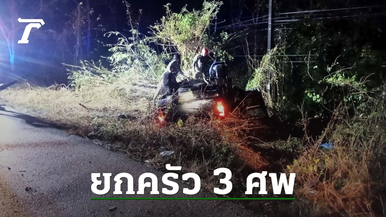 "อุบัติเหตุสลด" กระบะเสียหลักพุ่งลงข้างทาง พลิกคว่ำหงายท้องสภาพพังยับ เสียชีวิตติดซาก 3 ศพ "พ่อ-แม่-ลูก" คาดสาเหตุเกิดจากลมพายุ-ฝนตกหนัก
