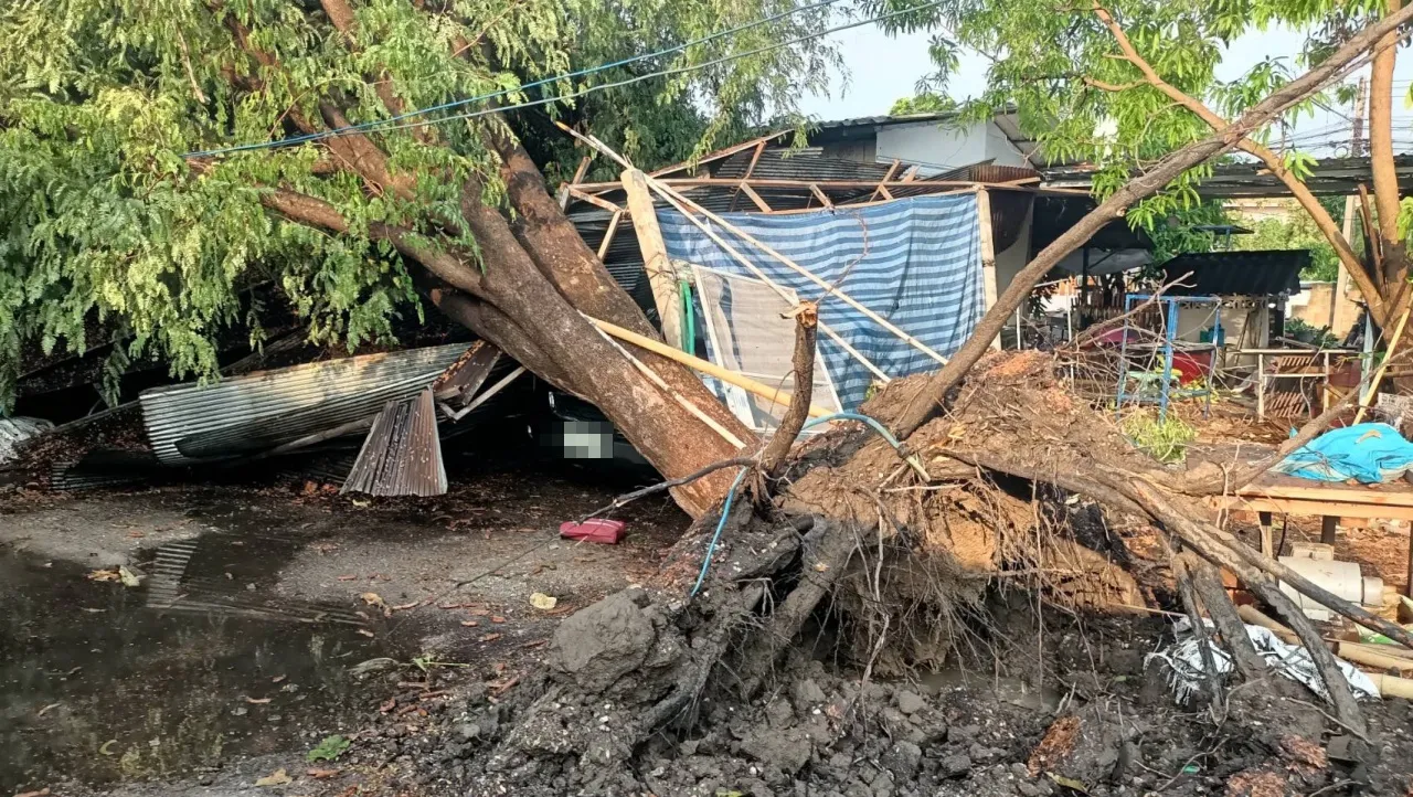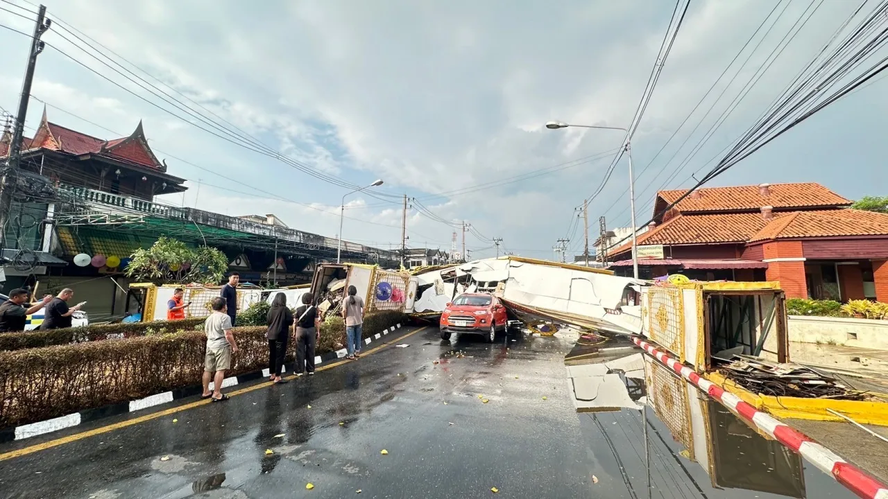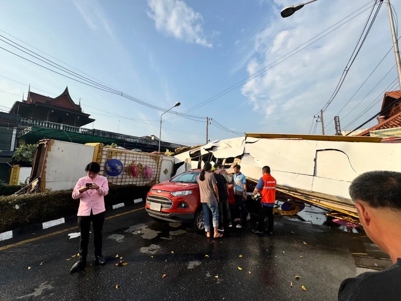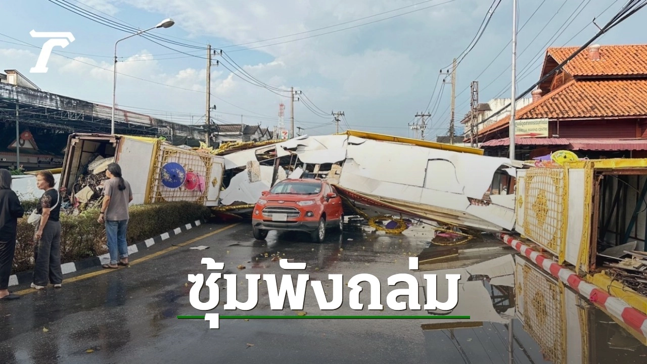"พายุฤดูร้อน" พัดถล่มในพื้นที่อำเภอสันกำแพง จังหวัดเชียงใหม่ ทำให้ซุ้มเฉลิมพระเกียรติฯ ขนาดใหญ่ พังทับรถ 2 คัน ที่วิ่งบนถนน โชคดีไม่มีผู้ได้รับบาดเจ็บ เจ้าหน้าที่อยู่ระหว่างสำรวจความเสียหาย