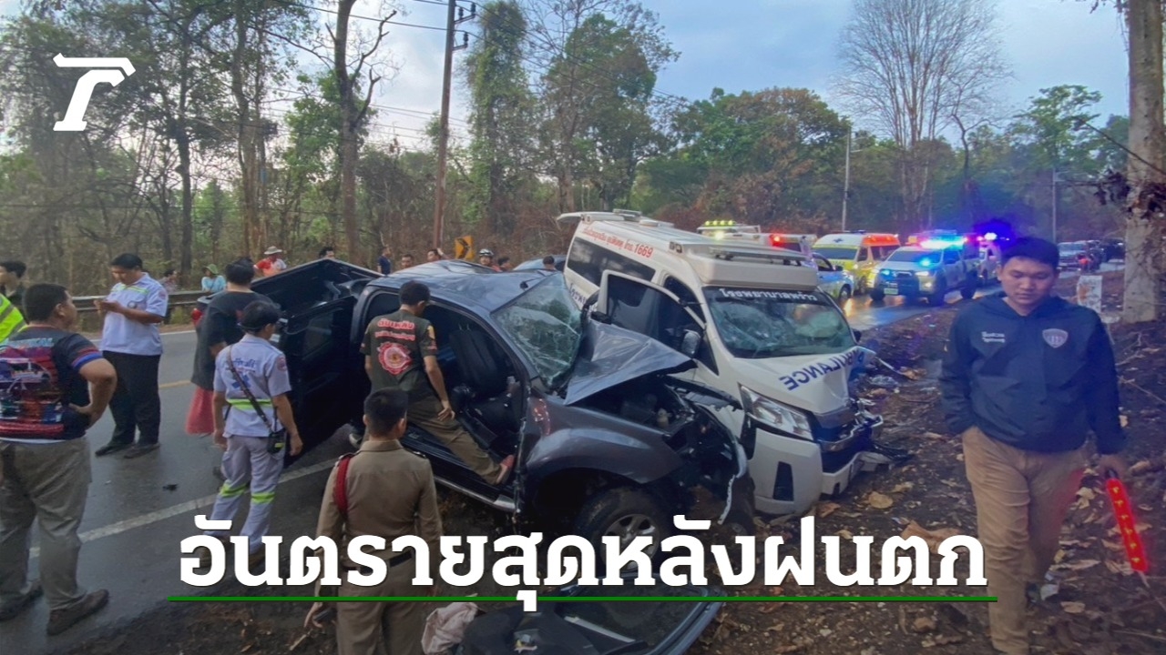 เจ้าหน้าที่ลงตรวจที่เกิดเหตุรถกระบะพุ่งชน รถกู้ชีพ รพ.พร้าว บนดอยหลวง หญิงท้องกำลังรีเฟอร์ไปคลอด เสียชีวิตพร้อมลูกในท้อง และฝั่งรถกระบะดับอีก 3 บาดเจ็บ 6 ราย พบเป็นจุดอันตราย ยิ่งตอนฝนตกถนนลื่น