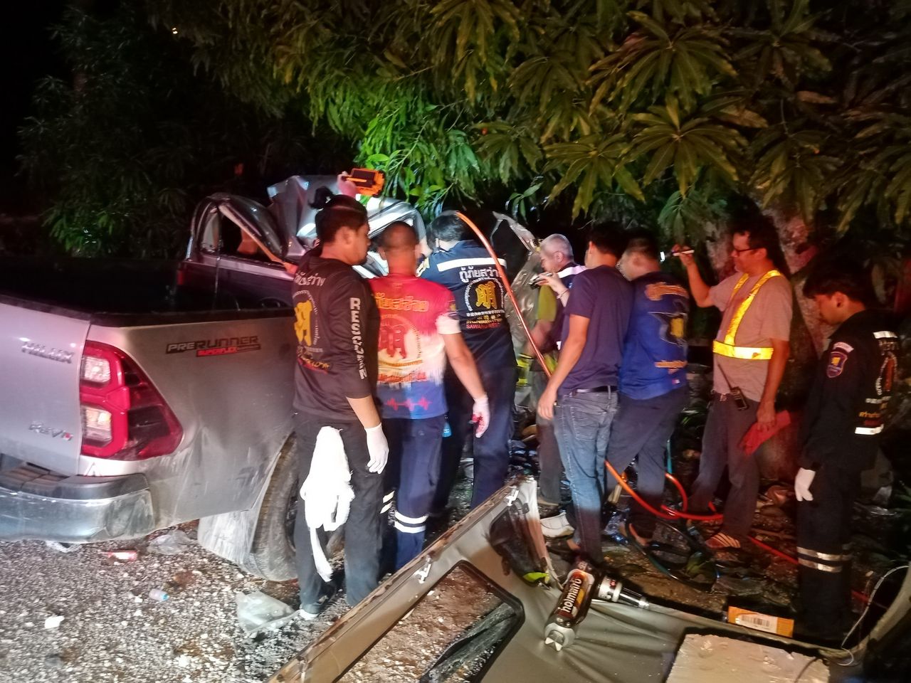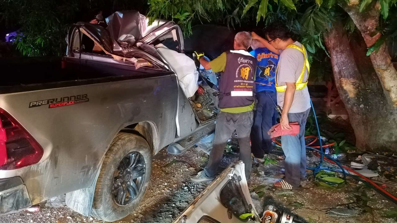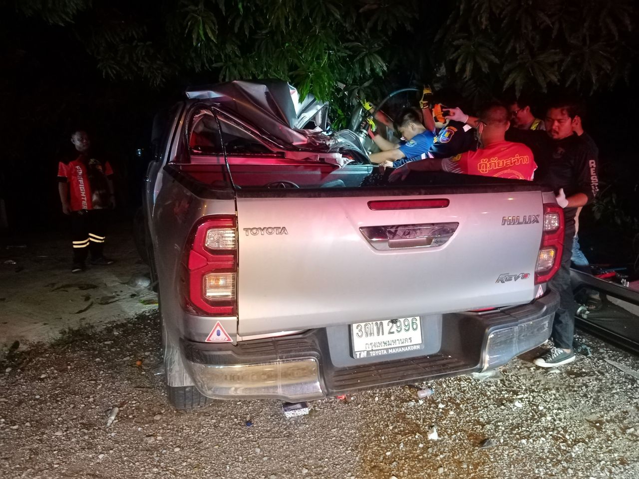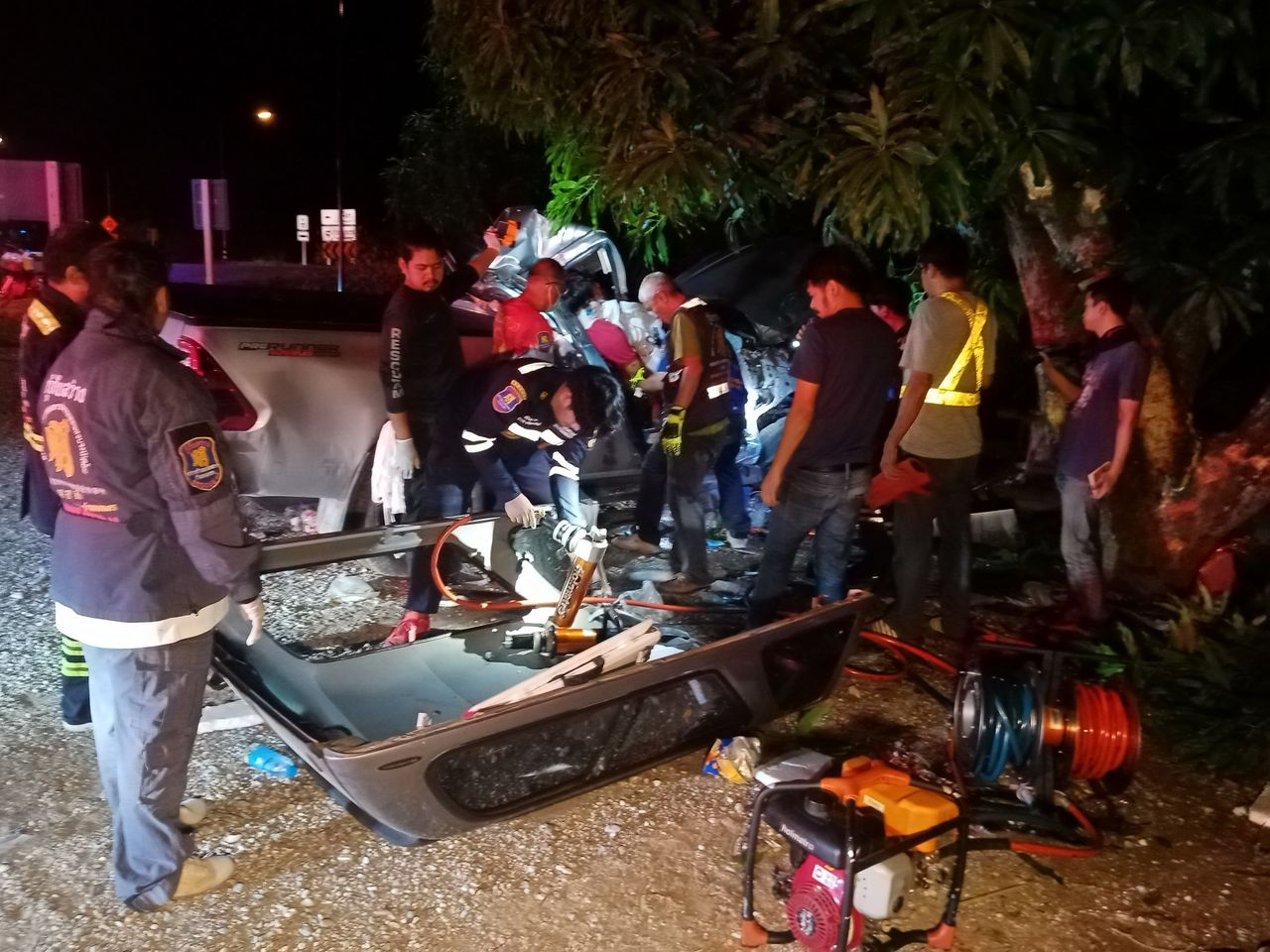 ที่เกิดเหตุพบรถยนต์กระบะยี่ห้อโตโยต้า สีบรอนซ์เงิน ทะเบียน 3 ฒท2996 กรุงเทพมหานคร ชนต้นมะม่วงใหญ่ข้างทางสภาพรถพังยับเยิน โดยก่อนชนต้นมะม่วงได้ชนหลักรายริมถนนหักไป 1 ต้น ส่วนภายในรถพบร่างของนายณัฐปคัลศ์ จารุทัสสนี อายุ 24 ปี อยู่บ้านเลขที่ 718 ซอยอนามัยงามเจริญ 25 แขวงท่าข้าม เขตบางขุนเทียน กรุงเทพมหานคร ถูกอัดก๊อบปี้ติดอยู่กับซากรถตรงเบาะที่นั่งคนขับ อาสาสมัครกู้ภัยมูลนิธิสว่างกำแพงเพชรธรรมสถาน ต้องช่วยกันใช้อุปกรณ์เครื่องตัดถ่างใช้เวลากว่าครึ่งชั่วโมง กว่าที่จะงัดร่างของผู้ตายออกจากซากรถได้ โดยใต้ต้นมะม่วงมีผลมะม่วงร่วงหล่นจากแรงชนเกลื่อนพื้น และแค่อีกเพียงวาเดียวรถก็พุ่งเข้าชนศาลเจ้าพ่ออู่ทองที่ตั้งอยู่ใต้ต้นมะม่วงแล้วแต่เกิดรถหยุดเสียก่อน
