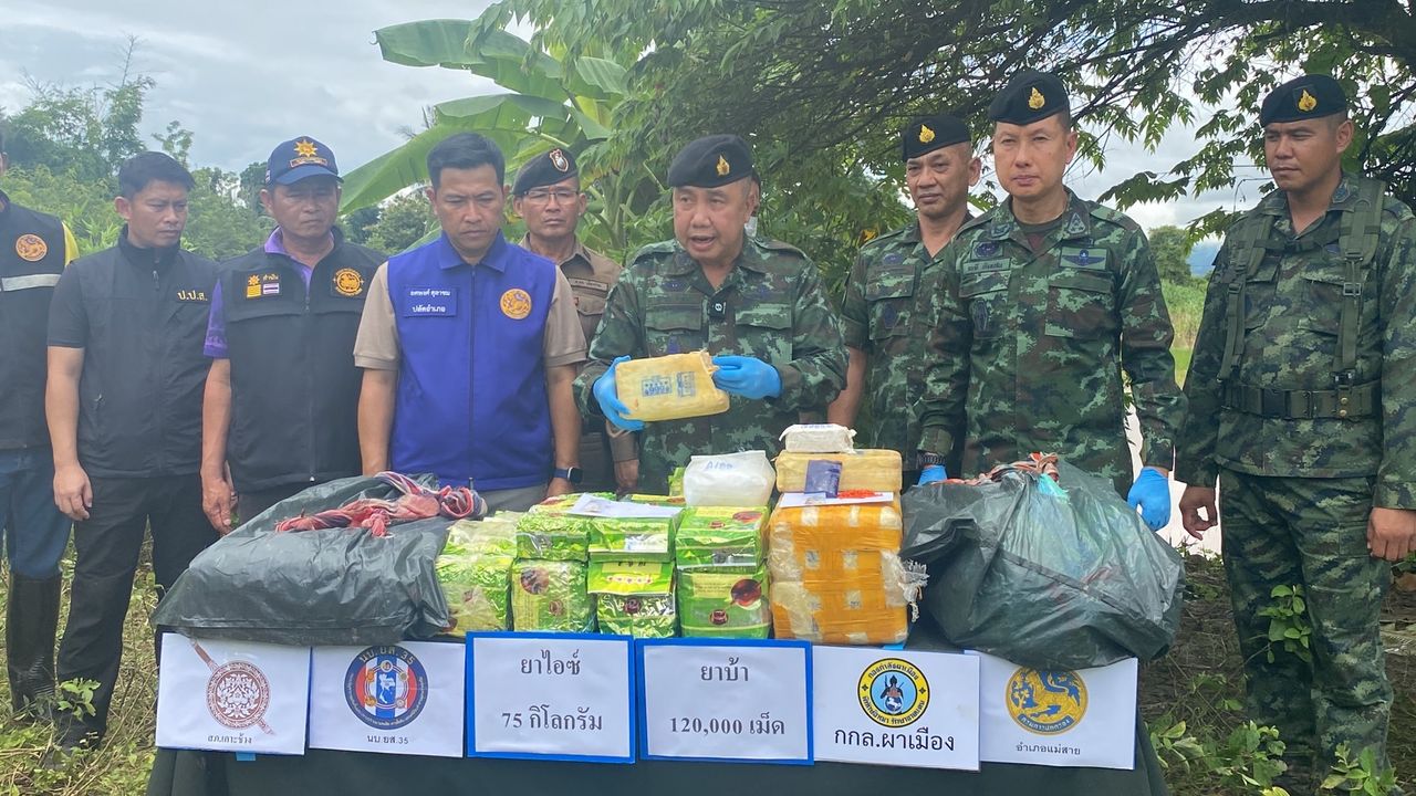 กระทั่งเช้าจึงเข้าตรวจสอบที่เกิดเหตุ พบเป้กระสอบดัดแปลงสะพายหลัง 1 ใบ ภายในบรรจุยาบ้า จำนวน 120,000 เม็ด และกระสอบบรรจุยาไอซ์ 3 ใบ บรรจุยาไอซ์ ใบละ 25 ถุง น้ำหนักถุงละ 1 กก. รวมน้ำหนัก 75 กก.