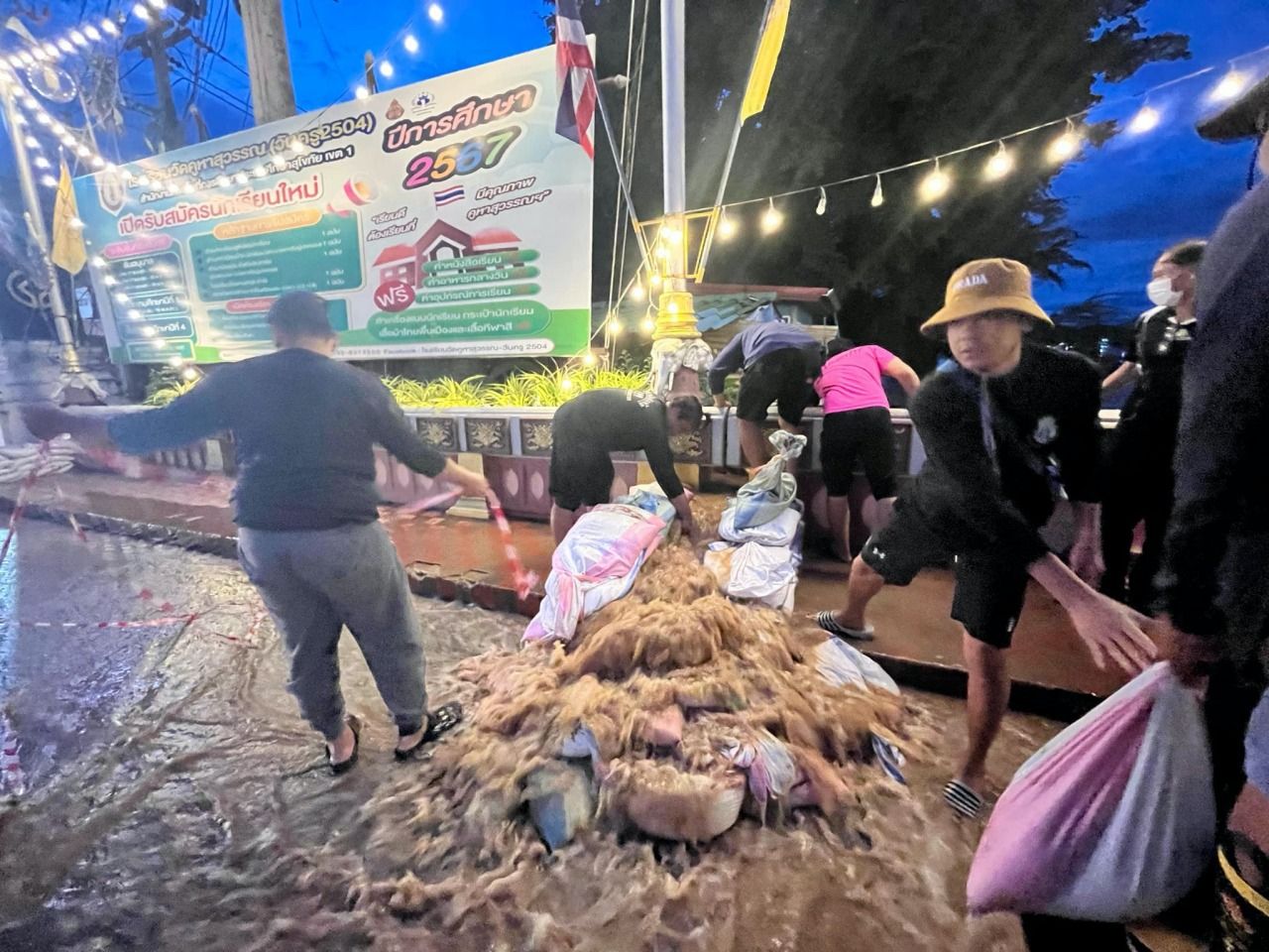 เวลา 06.00 น. มวลน้ำที่เพิ่มสูงขึ้นได้ไหลทะลักแนวพนังกั้นน้ำสูงเกือบ 2 เมตร บริเวณด้านหลังโกดังเบียร์ช้าง ต.ธานี อ.เมือง เจ้าหน้าที่ต้องระดมกำลังขนกระสอบทรายวางเสริมอีก 3 ชั้น ป้องกันมวลน้ำไหลทะลักเข้าท่วมชุมชนวังหิน นางพัฒสอน ดอนพิมพา นายกเทศมนตรีเมืองสุโขทัยธานี เร่งสั่งการให้เจ้าหน้าที่วางเสริมกระสอบทรายในทุกชุมชนที่อยู่ติดแม่น้ำยมเป็นการด่วนแล้ว