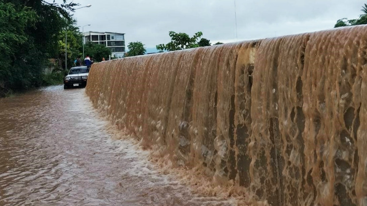 มีรายงานว่า เมื่อเวลา 00.40 น. ของวันที่ 25 ส.ค. มวลน้ำจากแม่น้ำยมที่ไหลผ่านสะพานพระร่วง เขตเทศบาลเมืองสุโขทัยธานี อ.เมือง ได้ทะลักบริเวณกลางสะพานและคอสะพาน ทำให้ไหลเข้าท่วมบริเวณโดยรอบอย่างรวดเร็ว เจ้าหน้าที่ต้องเร่งนำกระสอบทรายมาทำการอุดทุกจุดที่น้ำทะลักด้วยความโกลาหล ส่วนที่สะพานพระแม่ย่า เจ้าหน้าที่ได้ปิดการจราจร พร้อมวางบิ๊กแบ็กและกระสอบทรายเป็นแนวกั้นทั้งสองฝั่งของสะพาน เพื่อบังคับให้น้ำไหลไปตามเส้นทางปกติ ป้องกันไม่ให้ทะลักคอสะพานเข้าท่วมบ้านเรือนราษฎรในเขตชุมชนพระแม่ย่า