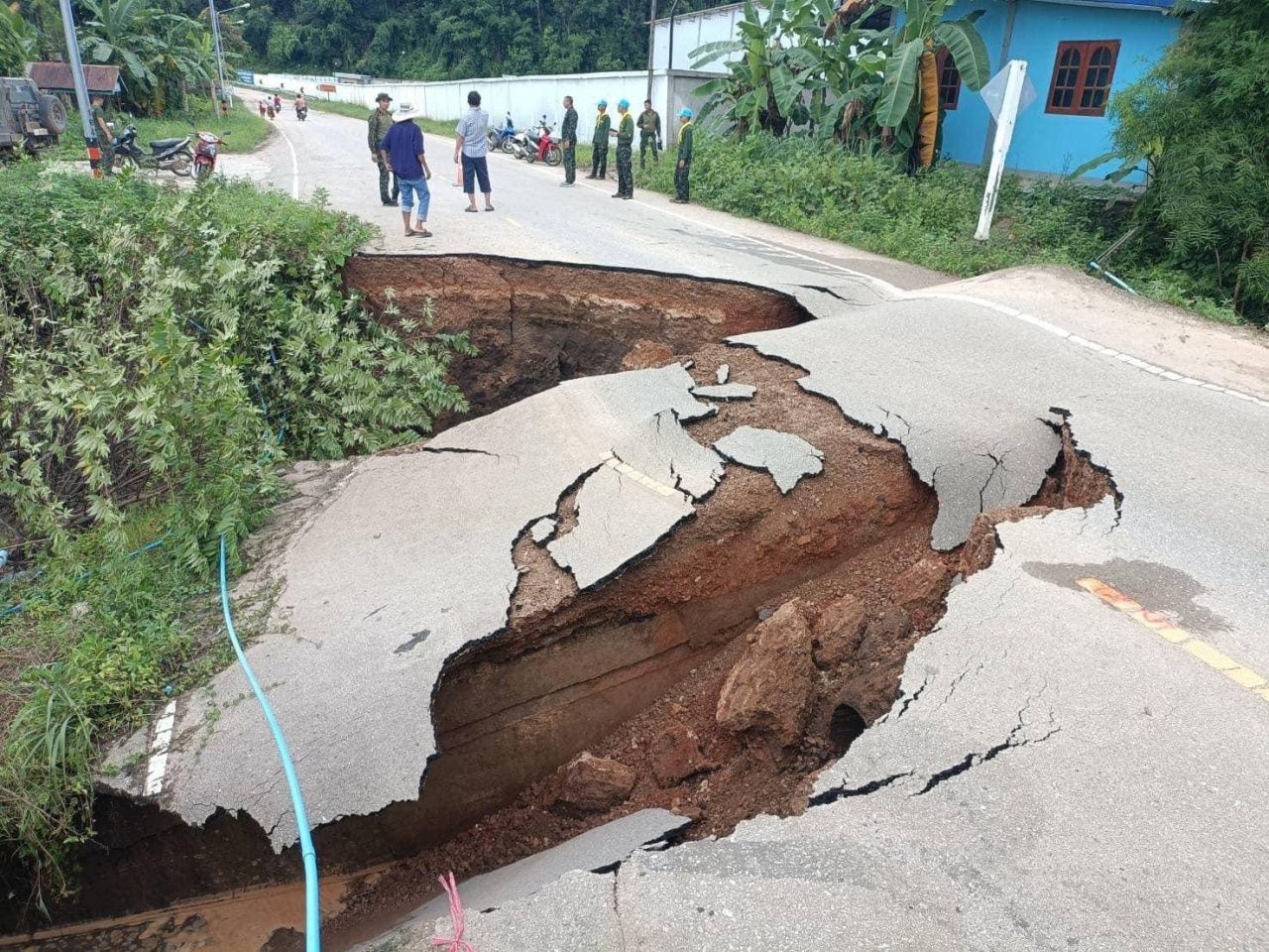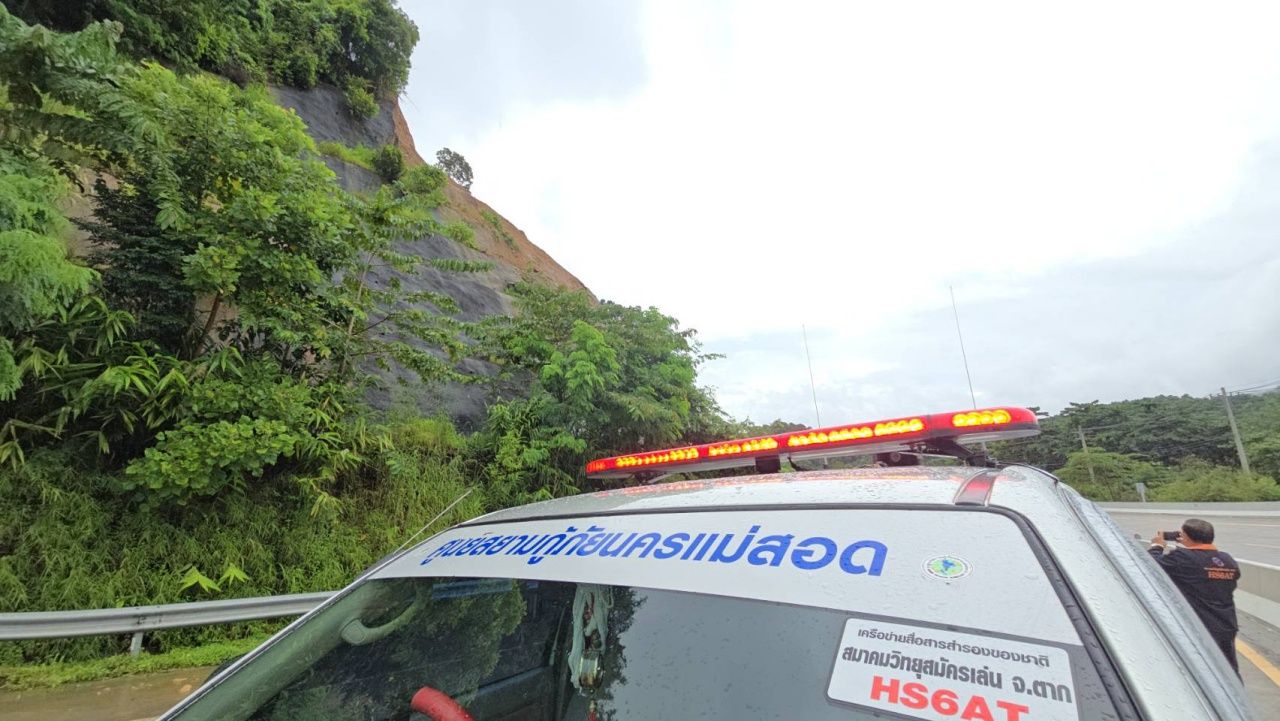ขณะที่ถนนสายแม่สอด-ตาก ฝนที่ตกหนักส่งผลทำให้เกิดดินภูเขาอิ่มตัวอุ้มน้ำฝนไม่ไหว เกิดการทรุดตัวและสไลด์ตัวไหลลงปิดทับเส้นทางถนนสายแม่สอด-ตาก ช่วงหลักกิโลเมตรที่ 27 ฝั่งขาออกจากตัวอำเภอแม่สอดไปตัวเมืองจังหวัดตาก โดยดินภูเขาสไลด์ตัวกว้างมากกว่า 50 เมตร จากยอดภูเขาสูงชันไหลทับบนถนนจุดดังกล่าว ส่งผลให้ถนนเต็มไปด้วยทั้งโคลนและดินแดงและแผ่นคอนกรีตไหลเต็มถนน ส่งผลทำให้รถทุกชนิดไม่สามารถใช้สัญจรได้