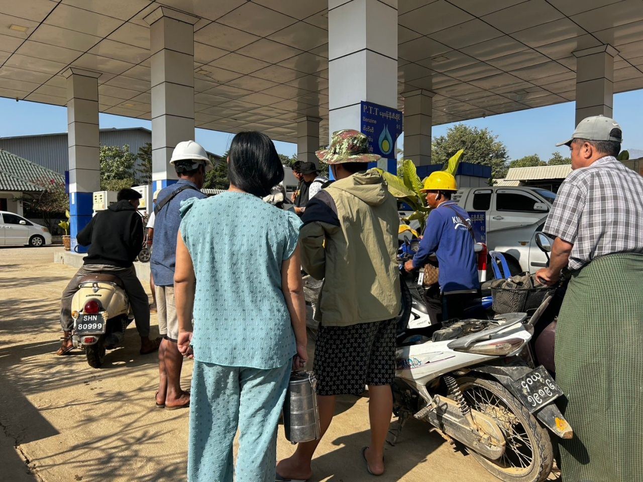 ต่อมาผู้สื่อข่าวลงพื้นที่เมืองท่าขี้เหล็ก ประเทศเมียนมา พบว่าบริเวณถนนสายหลักของท่าขี้เหล็ก พบว่าชาวบ้านยังคงขับรถยนต์ รถจักรยานยนต์ พร้อมถังแกลลอน ไปรอคิวเติมน้ำมันตามปั๊มน้ำมันต่างๆ เป็นวันที่ 3 เนื่องจากมีราคาถูกกว่าฝั่งไทย โดยราคาน้ำมันดีเซล และเบนซิน ราคาลิตรละ 29 บาท เป็นราคาเดียวกันทุกชนิด เหมือนกันทุกปั๊ม โดยจะมีคนคอยปิดประตูรั้วของปั๊มให้ต่อแถวทยอยเข้าออกประตูเดียว และเติมจำกัดจำนวน ซึ่งประชาชนก็ยังพยายามเบียดเสียดเข้าไปเติมน้ำมันกัน และทางการเมียนมาสั่งไม่ให้ทางปั๊มกักตุนน้ำมันเพื่อขึ้นราคา ส่วนการจำหน่ายน้ำมันเป็นขวดตามริมถนน เริ่มไม่มีวางขาย เพราะถูกจำกัดการซื้อไปเก็งกำไร