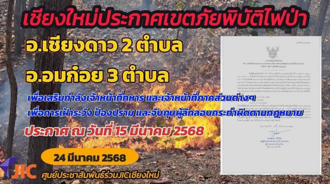 ผู้ว่าฯ เชียงใหม่ ออกประกาศเขตพื้นที่ประสบสาธารณภัย และเขตการให้ความช่วยเหลือผู้ประสบภัยพิบัติกรณีฉุกเฉิน อัคคีภัย ไฟป่า รวม 5 ตำบล ใน 2 อำเภอ ได้แก่ อ.เชียงดาว และ อ.อมก๋อย พร้อมสั่งการเร่งให้ความช่วยเหลือ