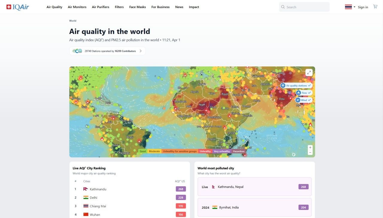 ด้านเว็บไซต์ iqair. ซึ่งจัดอันดับดัชนีคุณภาพอากาศ (AQI⁺) และมลพิษทางอากาศ PM 2.5 ทั่วโลก เมื่อเวลา 11.21 น. พบว่า "เชียงใหม่" ขึ้นมาอยู่อันดับที่ 3 ของโลกวัดได้ 170 ไมโครกรัมต่อลูกบาศก์เมตร