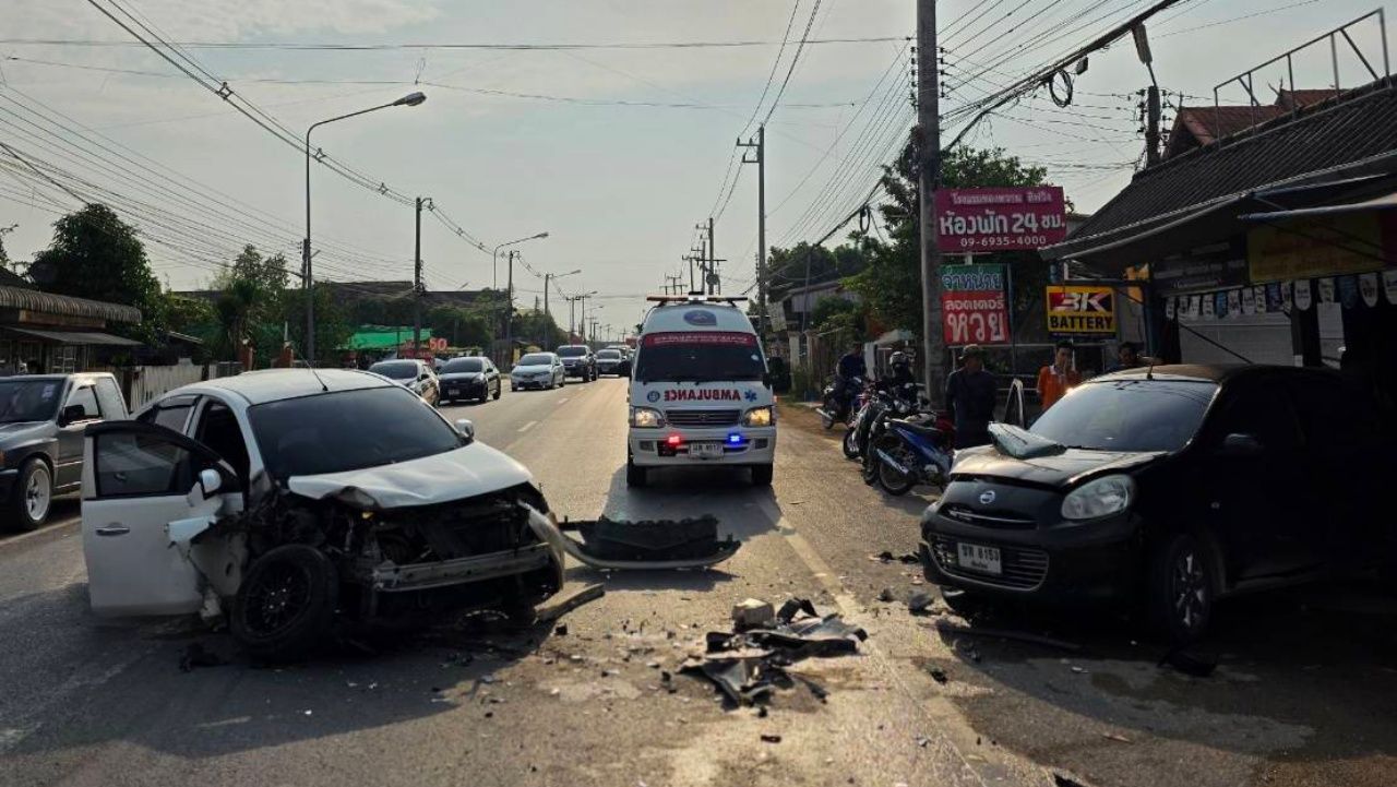 ตอนนั้นพวกตนที่นั่งอยู่ต่างก็ตกใจ และออกไปดูเหตุการณ์ พบมีรถยนต์เก๋งยี่ห้อนิสสัน มาร์ช สีดำ ทะเบียนเชียงใหม่ ด้านท้ายรถชนกับแผงลอตเตอรี่ ด้านหน้ารถมีรอยโดนชนหันหน้าออกถนน และอีกฝั่งของถนนพบรถยนต์ยี่ห้อนิสสัน อัลเมร่า สีขาว ทะเบียนเชียงราย ด้านหน้าถูกชนพังเสียหาย จึงแจ้งหน่วยงานที่เกี่ยวข้องมาตรวจสอบ