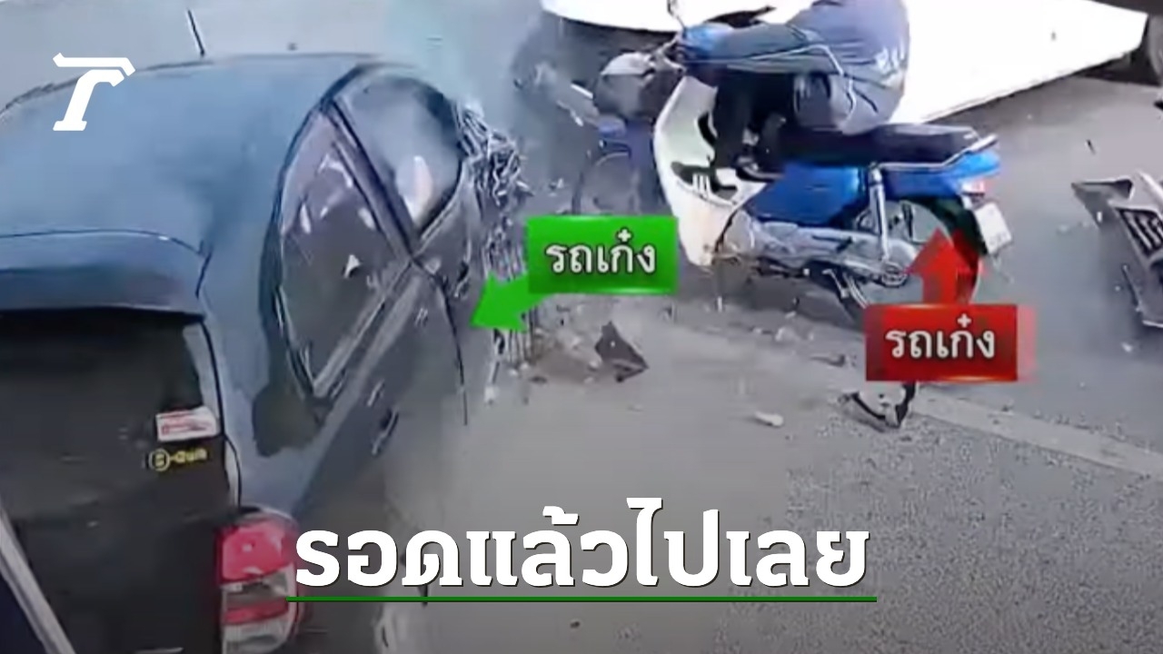 คลิปวงจรปิด นาทีเก๋งขาววิ่งข้ามเลนชนประสานงาเก๋งดำ มอเตอร์ไซค์วิ่งตามมเบรกไม่ทัน ขี่ฝ่ากลางวง รอดตายฉิวเฉียด